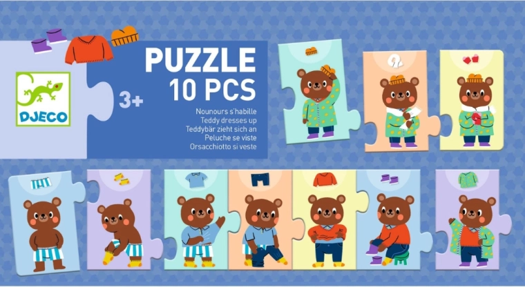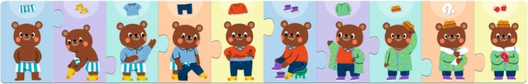 Scoprite la magia dei primi puzzle narrativi. I bambini imparano a riconoscere il giusto ordine delle attività – dall'abbigliamento fino all'outfit completo – esercitando pazienza, concentrazione e coordinazione occhio–mano. I pezzi sono realizzati in cartone resistente, adatto anche a frequenti manipolazioni da parte delle piccole mani.