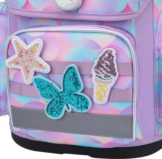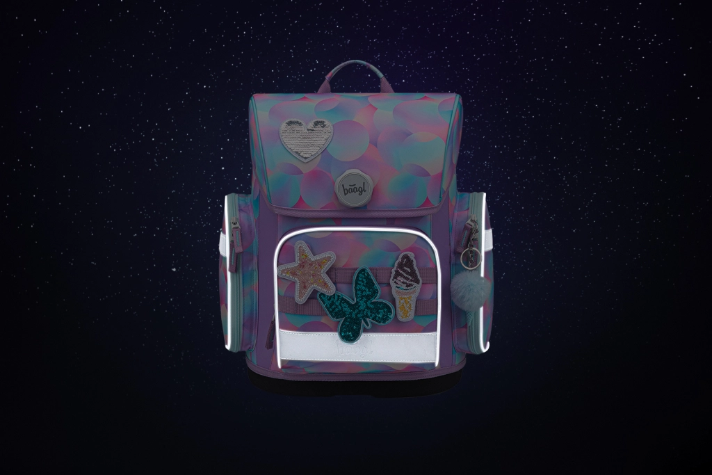 Per la sicurezza dei bambini, la cartella è dotata di elementi riflettenti. Il divertente sistema di badge intercambiabili permette di personalizzare l’aspetto in base all’umore. La linea ERGO è testata e certificata in un laboratorio di prova accreditato.