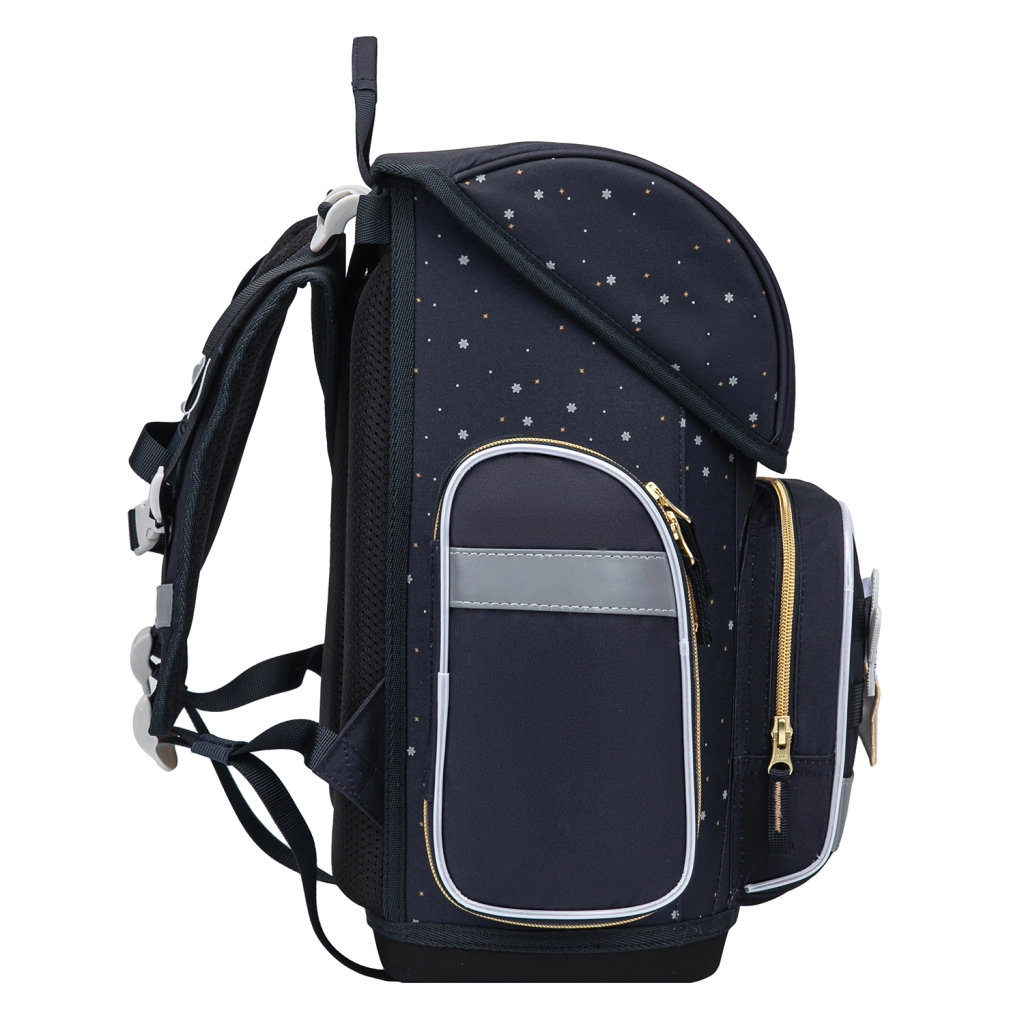 Il materiale idrorepellente, il fondo rigido e le cerniere di qualità proteggono il materiale scolastico con qualsiasi tempo. L’intelligente suddivisione dello spazio interno con organizer, orario delle lezioni e cinghia di trazione mantiene i libri più pesanti vicino alla schiena per una migliore stabilità. La tasca frontale isolata e le due tasche laterali ospitano la merenda e la bottiglia dell’acqua. Non mancano elementi riflettenti per la sicurezza al crepuscolo.