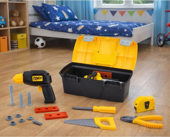 Questo pratico set di attrezzi per bambini offre tutto ciò di cui un piccolo riparatore ha bisogno: trapano a batteria, martello, seghetto, cacciavite, pinze, metro, viti e componenti da costruzione. La resistente valigetta con manico mantiene tutto in ordine e facilita il trasporto in viaggio.