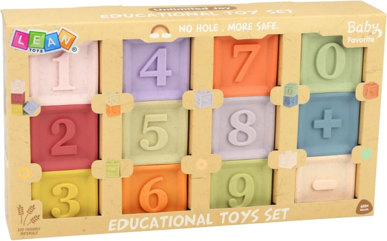 Ogni cubo riporta in rilievo le cifre 0–9 e i simboli matematici di base, aiutando i bambini a comprendere il conteggio e le operazioni semplici in modo naturale e ludico.