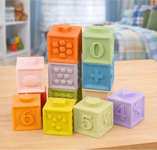 La gomma elastica e morbida permette di schiacciare i cubi, impilarli in sicurezza e tenerli comodamente in mano. La dimensione di 5 × 5 cm è ideale per le piccole mani dei bambini.