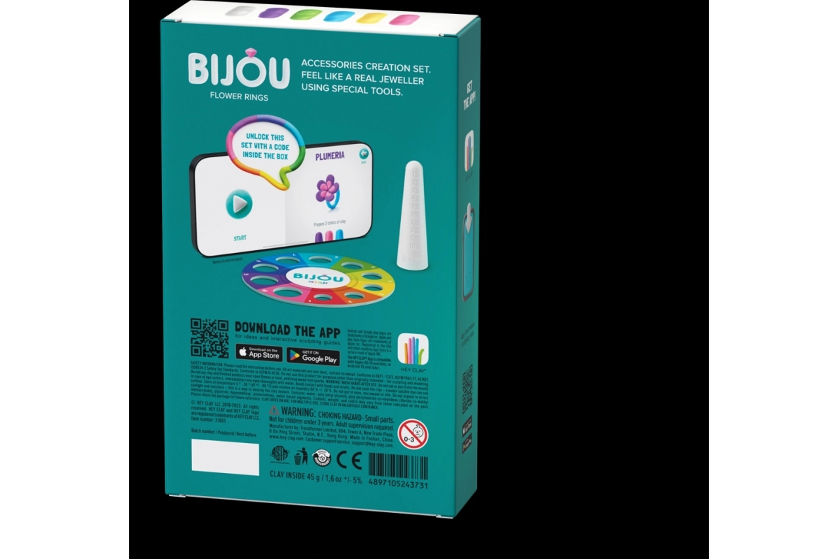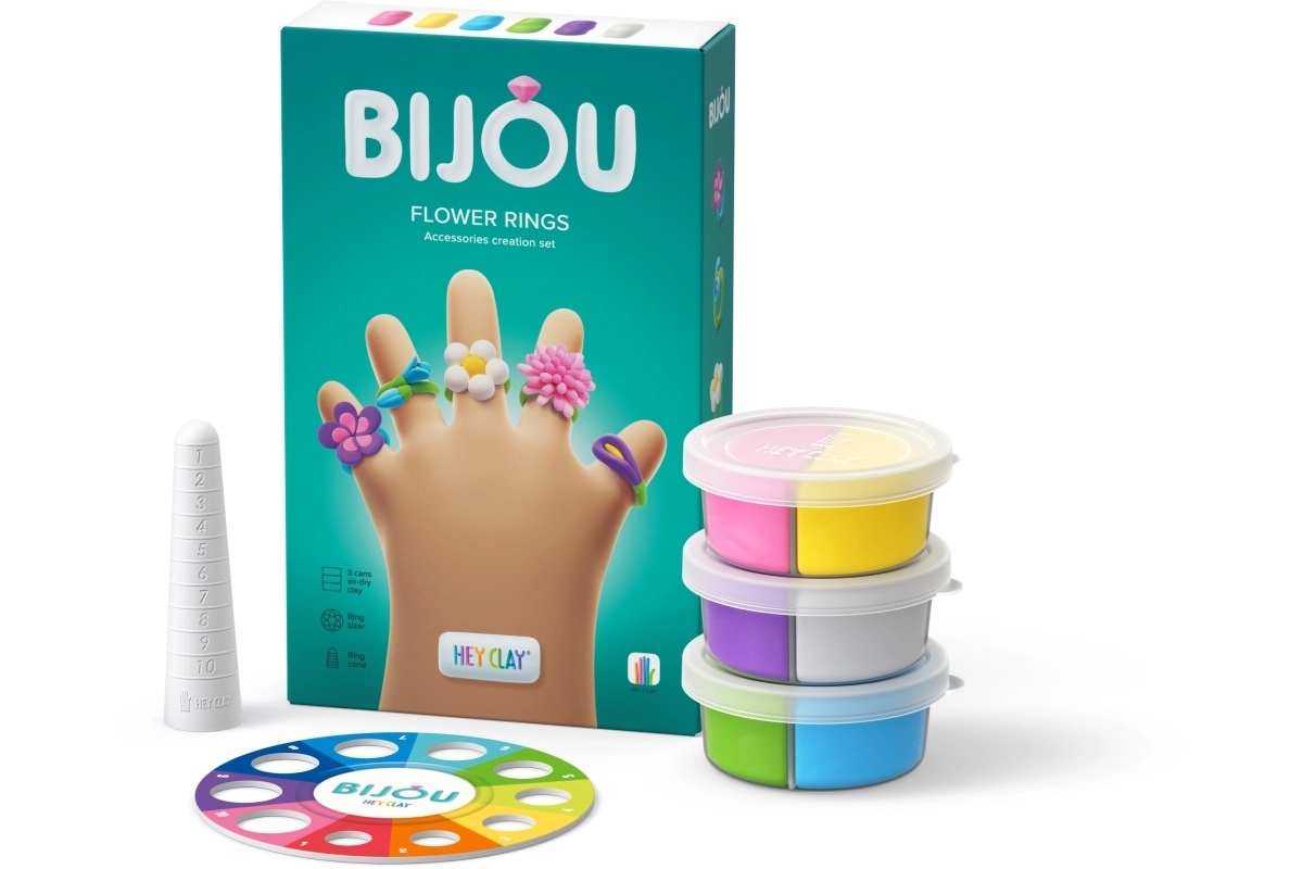 Crea i tuoi gioielli originali con il set creativo HEY CLAY Bijou anelli floreali. La pasta modellabile, morbida e leggera, mantiene facilmente la forma e, dopo 24 ore all’aria, indurisce diventando un gioiello resistente. La confezione include 3 vasetti di pasta, 2 basi per anelli, un attrezzo modellante speciale e l’accesso all’app mobile HEY CLAY con tutorial video interattivi passo dopo passo. Creazione ideale per bambini da 3 anni.