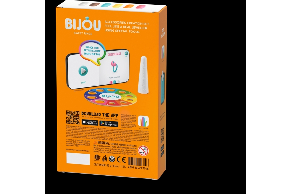 Scopri la creazione giocosa di gioielli con il set HEY CLAY Bijou. Grazie alla pasta leggera e morbida, i bambini realizzano in un attimo anellini unici ispirati ai dolci. Il materiale asciuga naturalmente all’aria e indurisce in 24 ore: il risultato è un gioiello leggero ma resistente, da indossare con orgoglio.