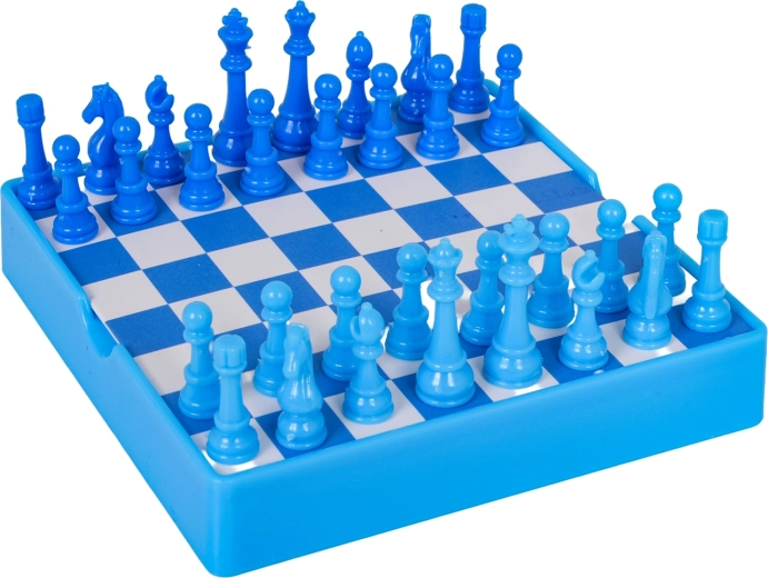 Scacchiera in plastica con bordi rialzati e pedine in due tonalità di blu che garantiscono una facile manipolazione e una lunga durata.