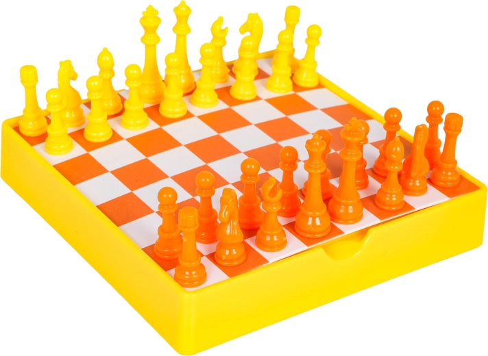 Il classico gioco degli scacchi per bambini in una pratica versione da viaggio con scacchiera arancione e bianca e pedine gialle e arancioni. I colori vivaci attirano l’attenzione e incoraggiano i piccoli giocatori a concentrarsi e ad apprendere le mosse di base.