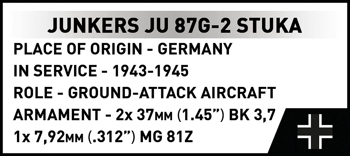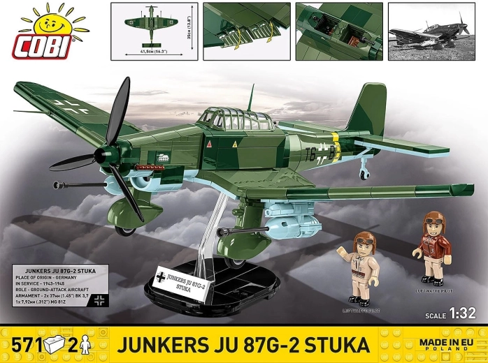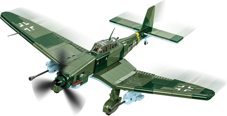 Incluso un supporto espositivo con targhetta “JUNKERS JU 87G-2 STUKA” e due minifigure di piloti con stampe dettagliate per un aspetto autentico del modello esposto.