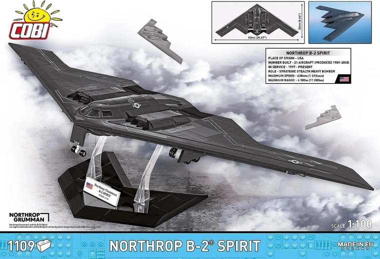 Crea la tua leggenda dell’aviazione: il NORTHROP B-2 SPIRIT di COBI è un set di costruzione preciso con eccellente accuratezza ingegneristica, che riproduce fedelmente la caratteristica “ala volante” e le superfici stealth piatte. Grazie alla scala 1:100 e ai pezzi progettati su misura otterrai un modello da esposizione di grande impatto con dettagli impressionanti.