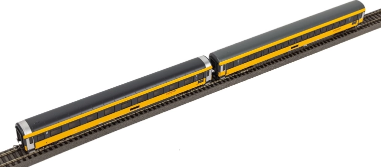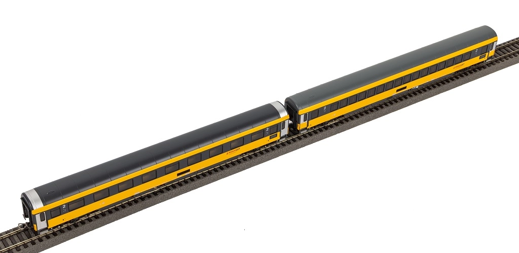 Questa novità 2025 propone una coppia di carrozze passeggeri di 2ª classe nella tipica livrea giallo‑nera di REGIOJET (epoca VI). Le carrozze in scala H0 (1:87) si distinguono per l’accurata realizzazione dei carrelli e dell’imperiale/inferiore, stampe precise e raffinati dettagli costruttivi. Le finestre incassate consentono una visuale libera sugli interni riprodotti in modo realistico.