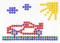 Il mosaico con piolini cristallini LENA è la scelta ideale per imparare divertendosi. I piolini colorati e traslucidi si inseriscono facilmente nella resistente tavoletta forata e permettono ai bambini di comporre motivi come pesciolini, aeroplani o fiori. Il gioco favorisce naturalmente la concentrazione, la coordinazione occhio–mano e il riconoscimento dei colori.