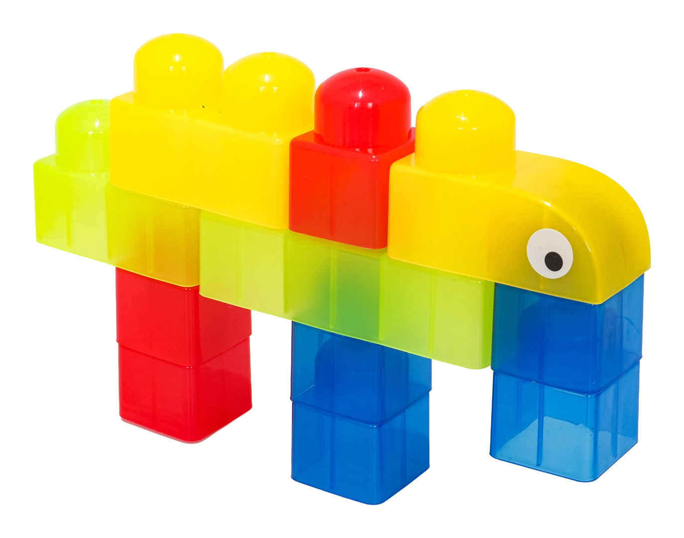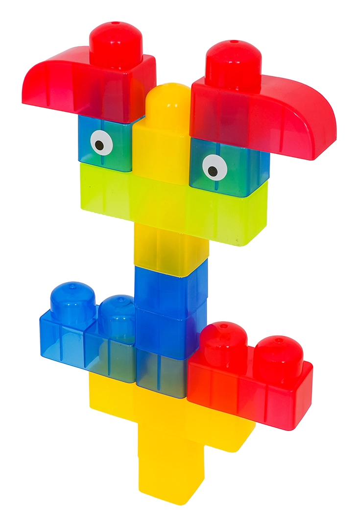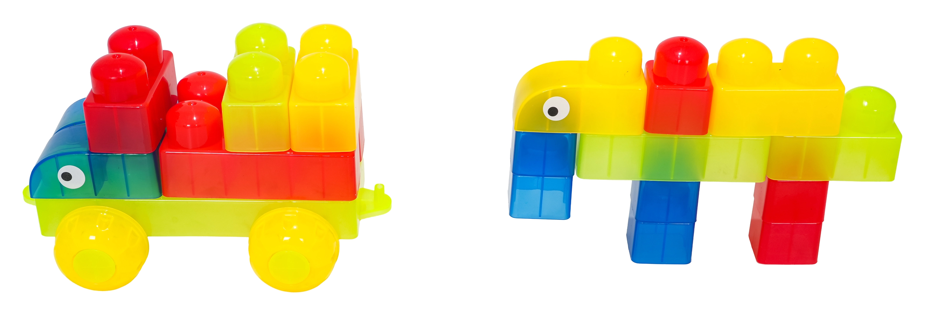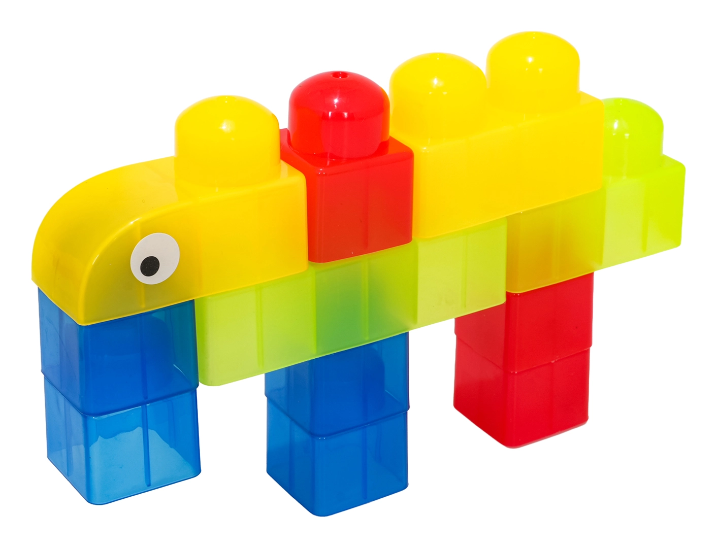 I grandi mattoncini, facili da afferrare, sviluppano la coordinazione occhio–mano e la fantasia durante il gioco libero o seguendo le istruzioni illustrate.