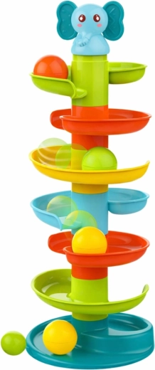 Sette piani colorati creano una spirale fluida. La lunga discesa delle biglie diverte i bambini e insegna i principi di causa ed effetto.