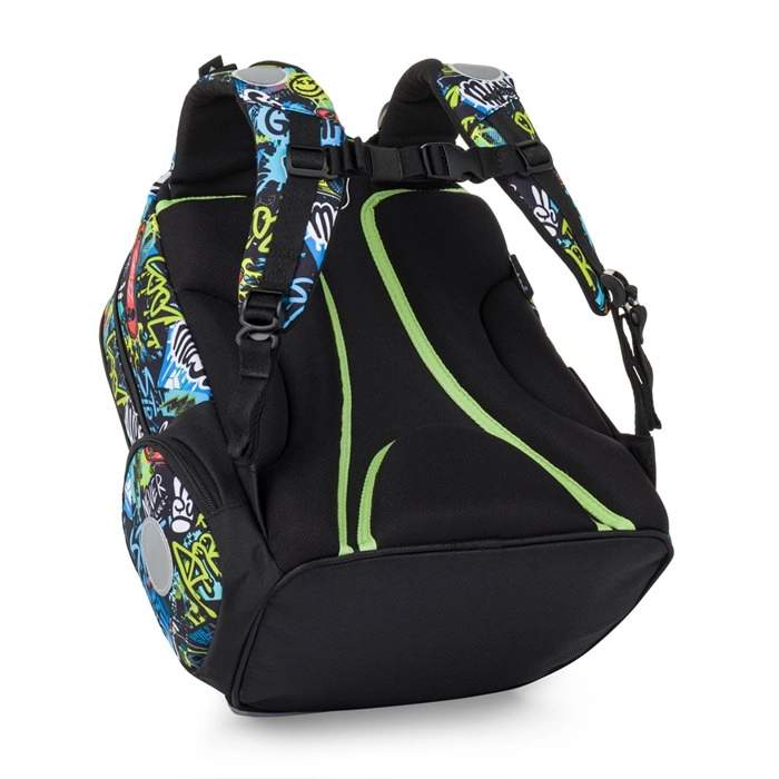 Lo zaino scolastico Oxybag OXY GO Funny Boy in moderno stile graffiti è progettato per bambini a partire da circa 125 cm di altezza (1ª–3ª classe). Grazie allo schienale anatomico e traspirante e agli spallacci regolabili offre comfort per tutto il giorno e il corretto supporto della schiena. Il fondo rigido impermeabile garantisce resistenza all’acqua e allo sporco, mantenendo il contenuto al sicuro.