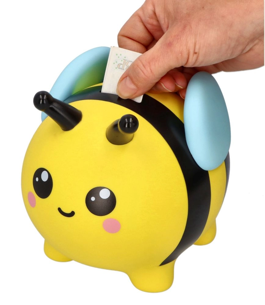 Una simpatica apetta che insegna a risparmiare! Questo grande salvadanaio in resistente PVC offre spazio a sufficienza per monete e banconote e, grazie alle zampette stabili, resta ben saldo al suo posto. Perfetto come decorazione per la cameretta e come dono pratico per piccoli risparmiatori. Grande capienza, struttura robusta e inserimento facile del denaro faranno felici bambini e genitori.