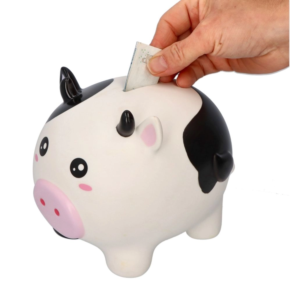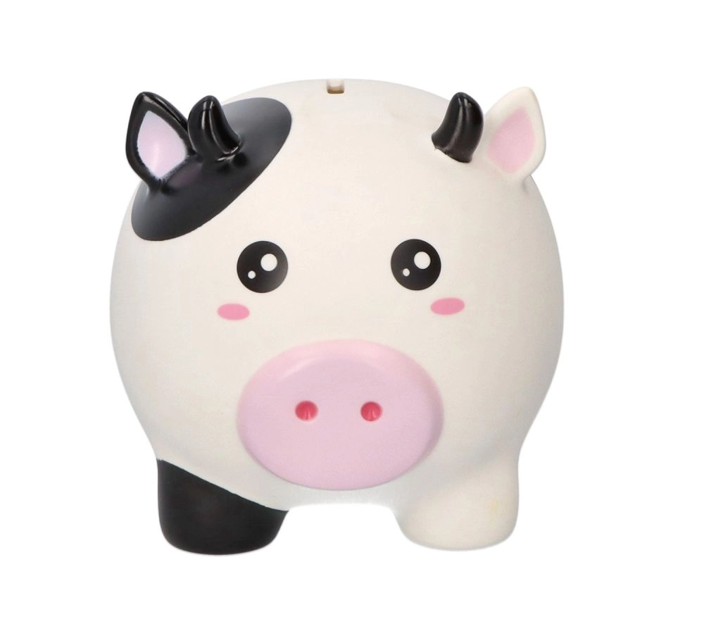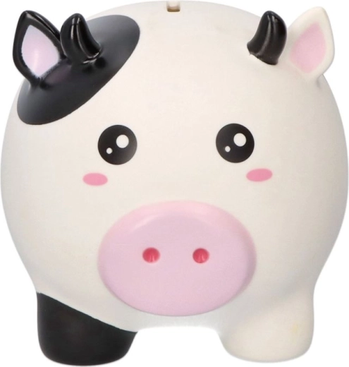 La mucca con macchie bianche e nere e musetto rosa rende il risparmio divertente – ideale per la cameretta e come idea regalo.