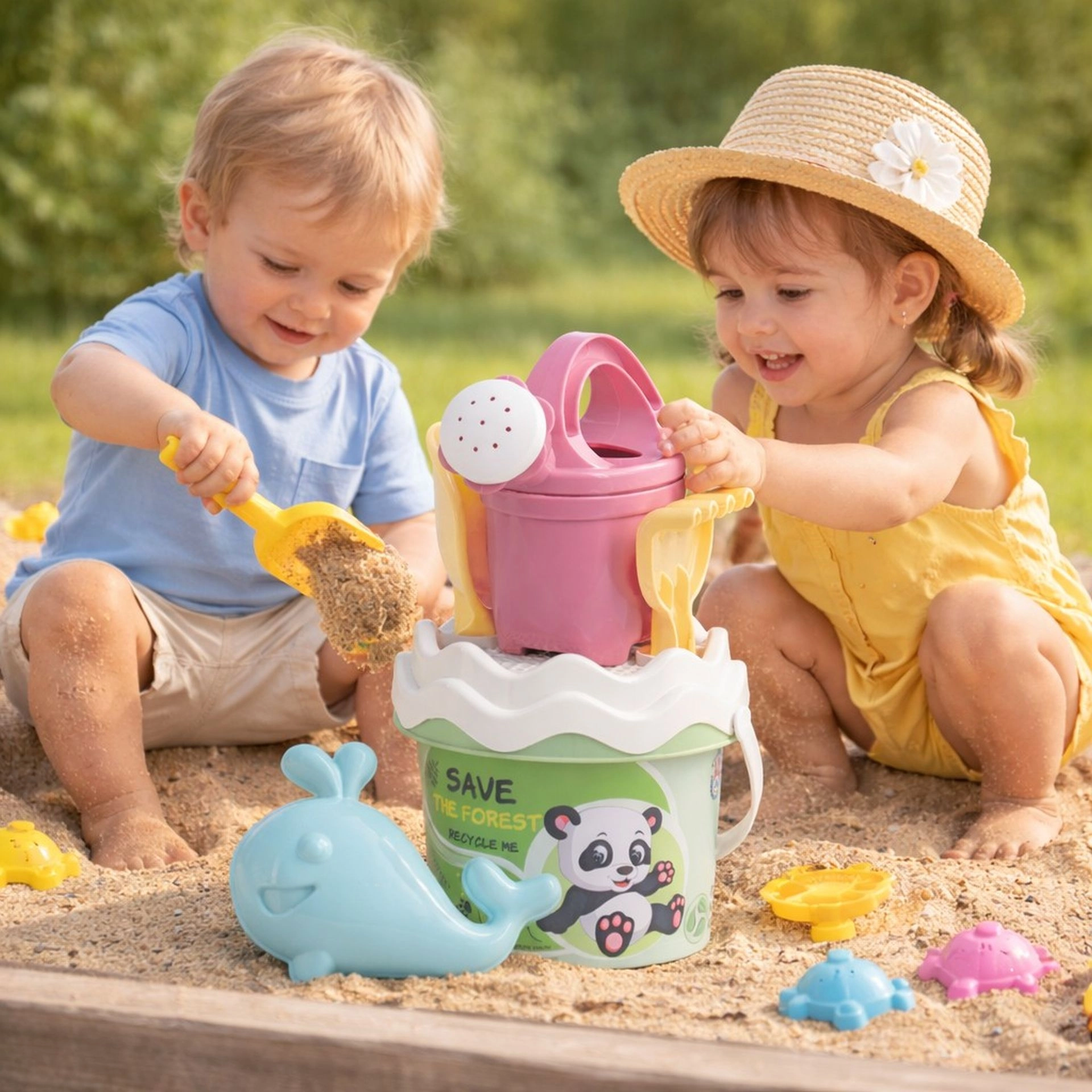 Scopri il divertimento estivo con questo set da sabbia da 6 pezzi in plastica riciclata di alta qualità dai delicati colori pastello. Offre ai bambini tutto il necessario per scavare, setacciare, annaffiare e modellare – secchiello con motivo panda, annaffiatoio da 0,5 l, setaccio, paletta, rastrellino e formina. Leggero, resistente e sicuro dai 10 mesi.
