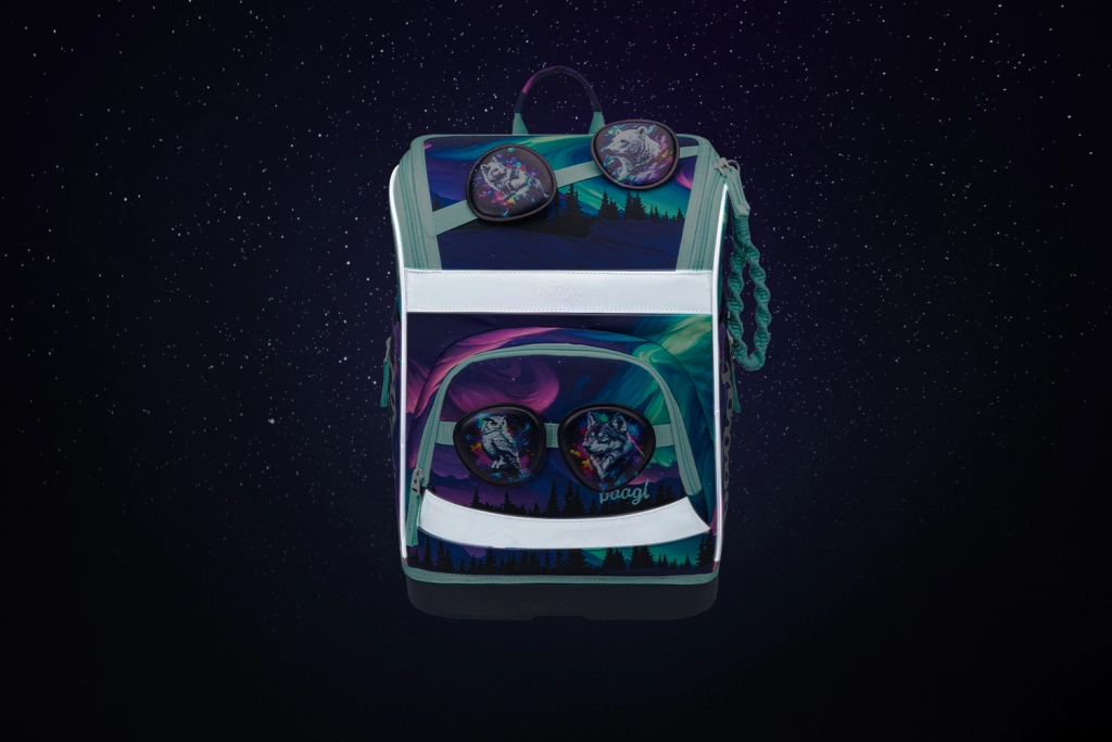 Il design ispirato all’aurora boreale con elementi riflettenti aumenta la visibilità. Distintivi intercambiabili permettono di abbinare l’aspetto all’umore e agli interessi del bambino.