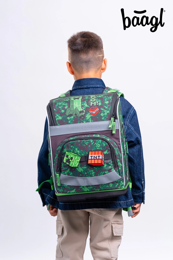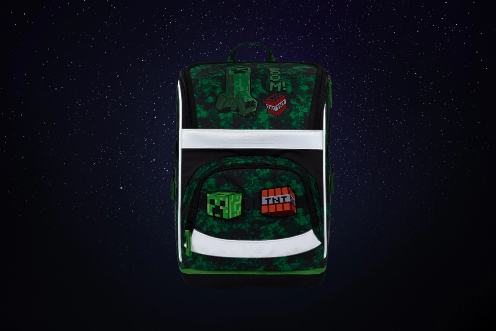 L’intero set è decorato con motivi di gioco MINECRAFT con camouflage a pixel ed elementi riflettenti per una migliore visibilità. Le cerniere YKK assicurano lunga durata e chiusura fluida, mentre i materiali riciclati e idrorepellenti resistono alle esigenze della vita scolastica.