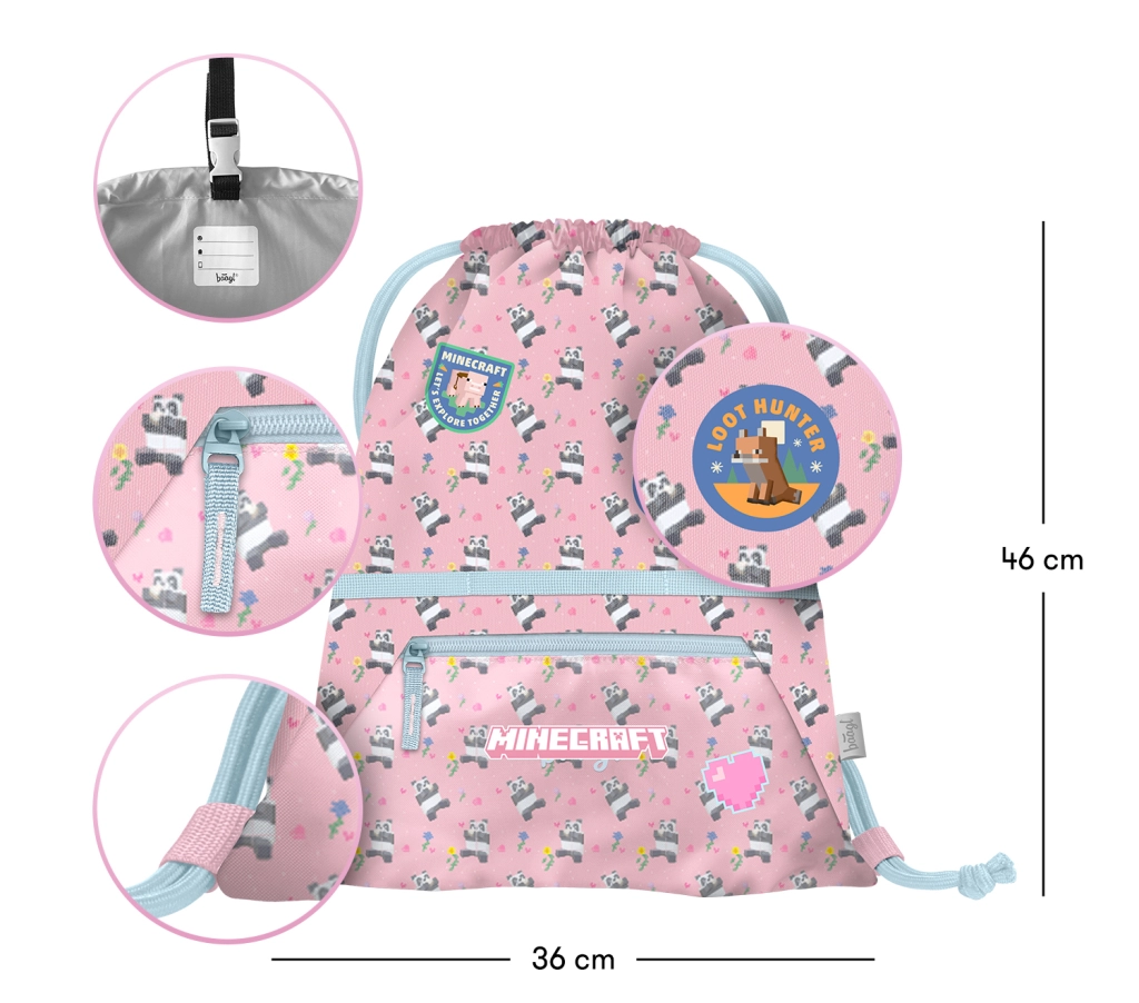 Pratica sacca scolastica con motivo MINECRAFT Panda e tasca frontale con zip, ideale per scarpe di ricambio, sport e tempo libero. È realizzata in materiale robusto e lavabile, ha cordini resistenti per un trasporto confortevole e un passante con fibbia per un facile aggancio allo zaino o alla cartella.