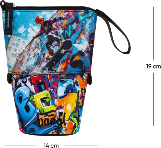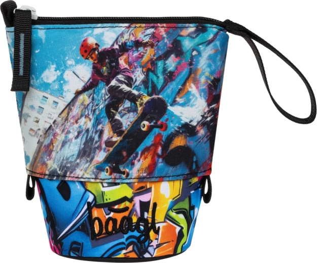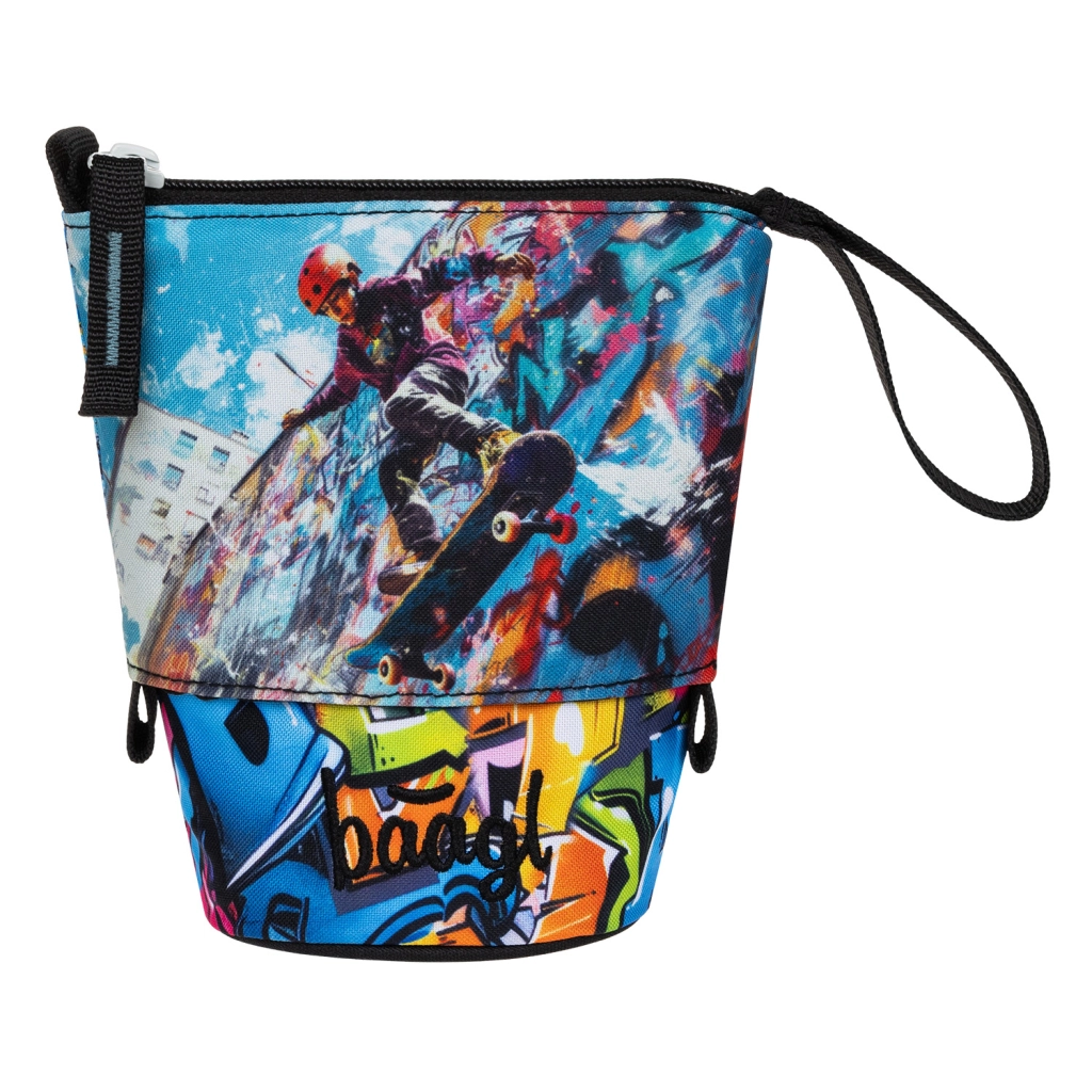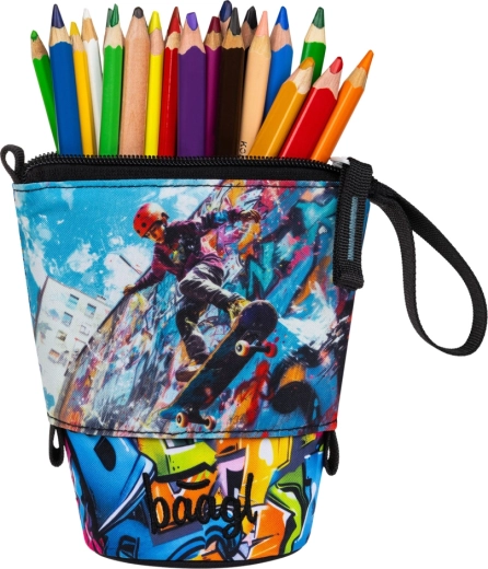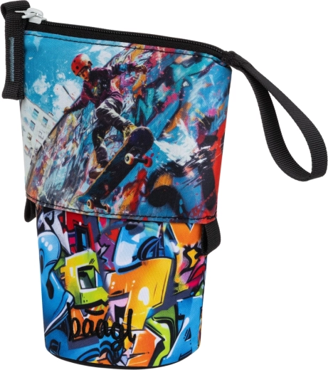 L’astuccio è prodotto responsabilmente e vanta la certificazione Global Recycled Standard (GRS), che attesta l’uso di almeno il 50% di materiali riciclati e il rispetto di elevati requisiti sociali ed ecologici. Unisce sostenibilità, funzionalità e un accattivante design graffiti con skateboarder.