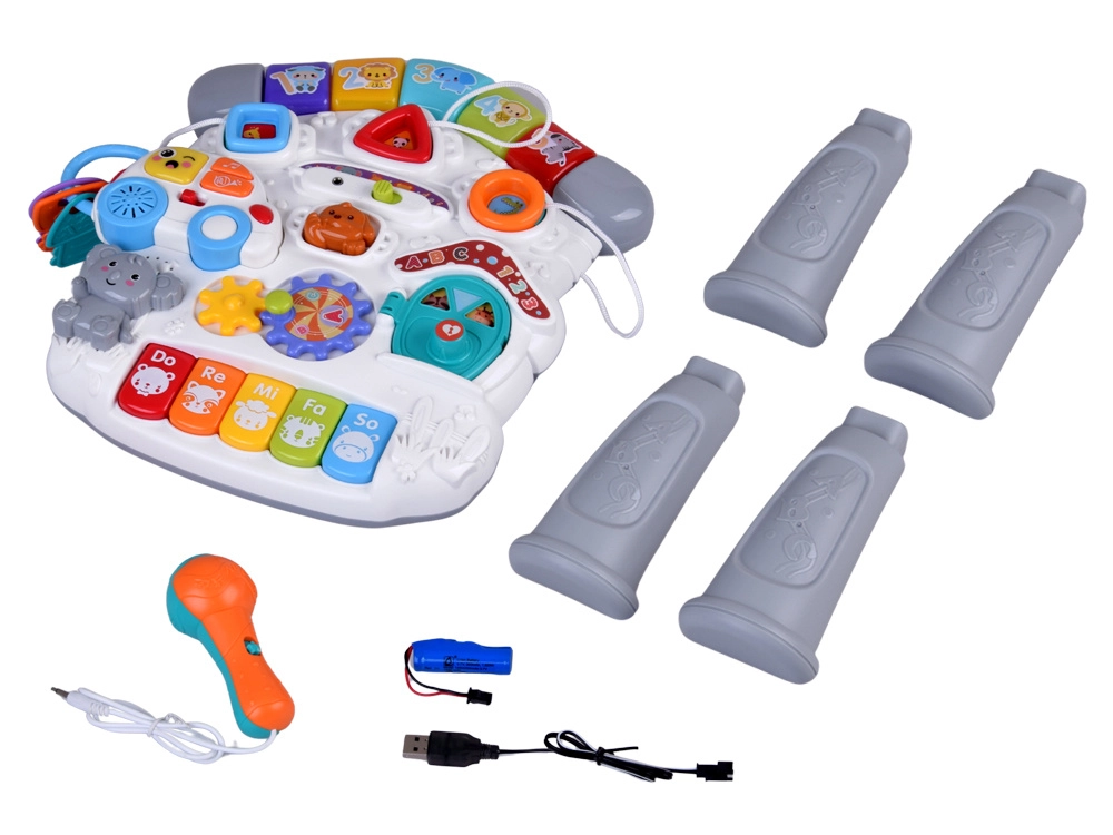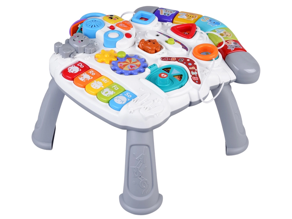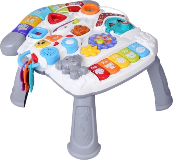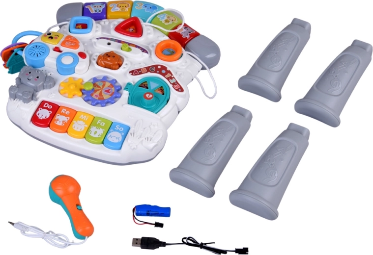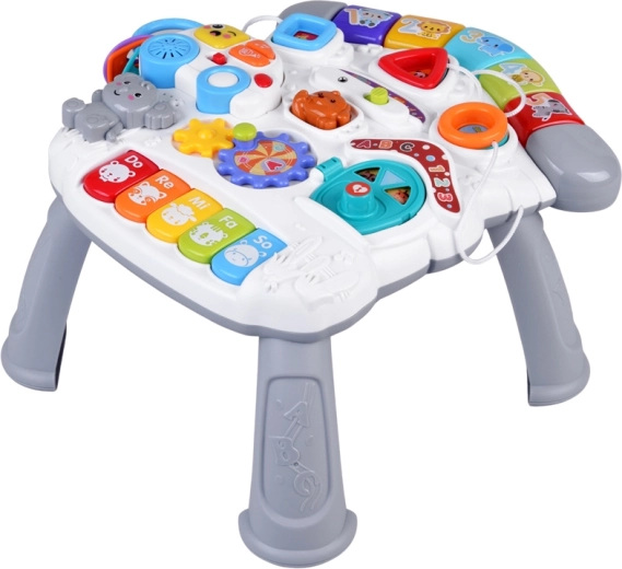 Il colorato tavolino interattivo per i più piccoli è un piccolo centro di scoperta e musica. Offre effetti luminosi, melodie, un mini pianoforte Do-Re-Mi, ingranaggi rotanti, pulsanti con forme e animaletti, una macchinina rimovibile con chiavi e un microfono. Sviluppa la motricità fine, la coordinazione mano-occhio, insegna colori, forme e suoni e favorisce il gioco autonomo.