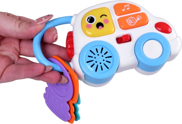 La piccola macchinina con luci e suoni propri può essere rimossa e usata separatamente. Le chiavi testurizzate si adattano perfettamente alle manine e invitano alla presa.