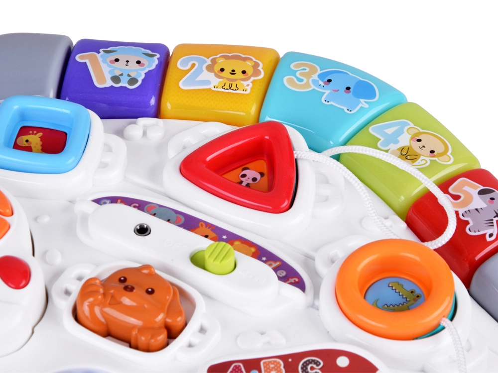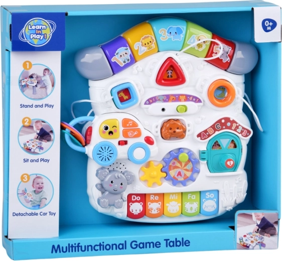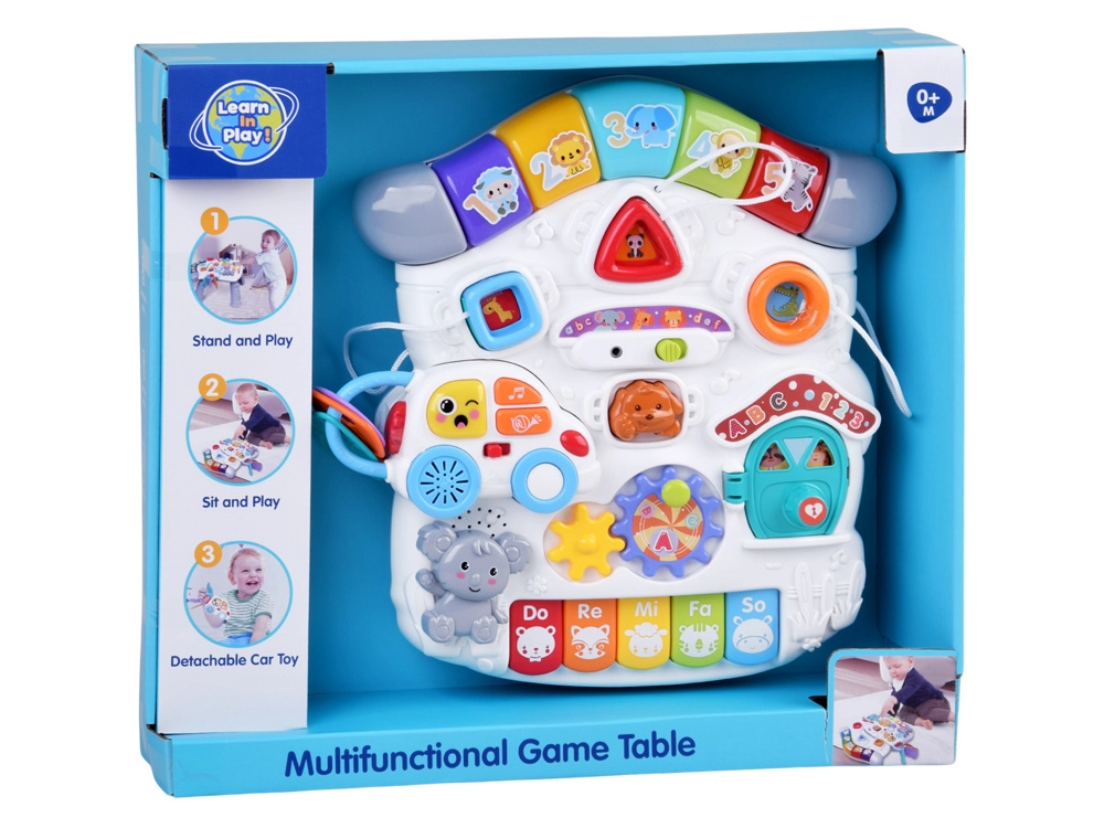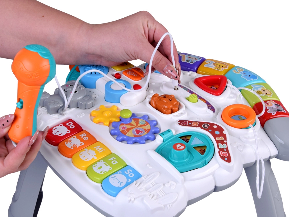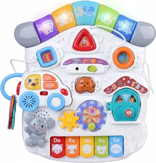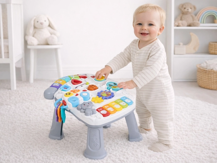 Il pannello musicale con tastiera Do–Re–Mi, microfono ed effetti divertenti stimola lo sviluppo sensoriale e il senso del ritmo. Il pannello delle forme aiuta a riconoscere colori, forme e animaletti, mentre la macchinina rimovibile con chiavi diverte anche fuori dal tavolino. Grazie alla ricca interazione, i bambini allenano la presa, la concentrazione e il pensiero logico.