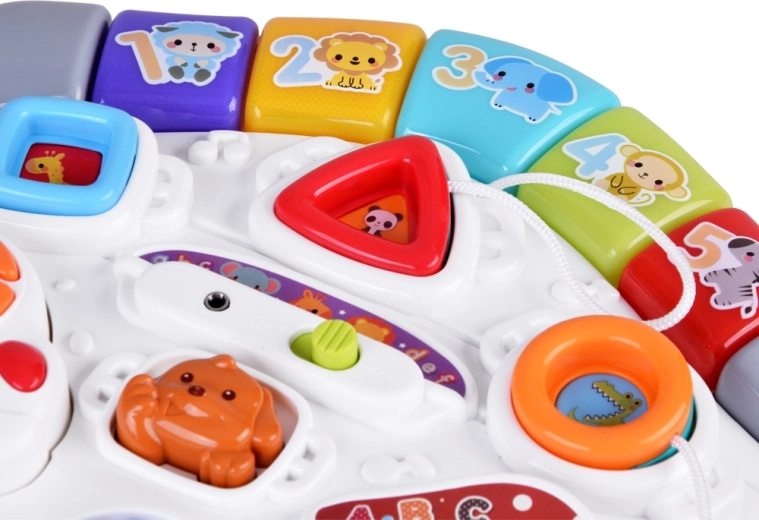 Il tavolino interattivo trasforma ogni gioco in un’avventura. Premendo i pulsanti, il bambino avvia allegre melodie, lucine e suoni di animaletti, gira gli ingranaggi, fa scorrere gli elementi e scopre sorprese nascoste sotto le forme. Le gambe stabili e la struttura resistente garantiscono un uso sicuro e una lunga durata.