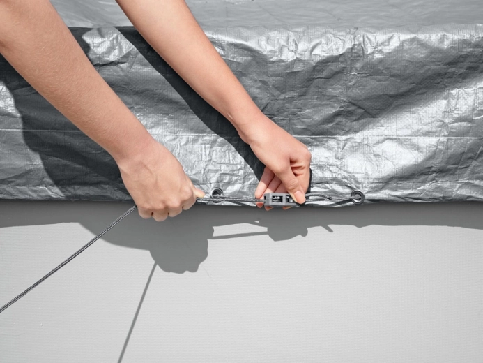 Gli intelligenti fori di drenaggio lasciano passare l’acqua piovana, evitando che si formino pozzanghere sulla copertura. Il meccanismo di serraggio antivento e il cordino assicurano un’aderenza stabile lungo il bordo, affinché la copertura resti al suo posto anche in condizioni meteo avverse.