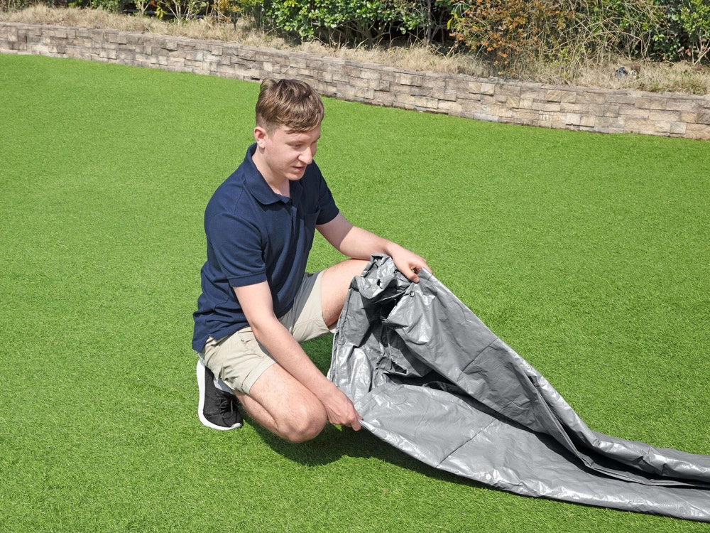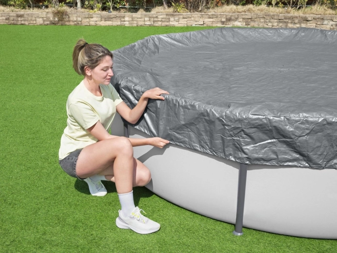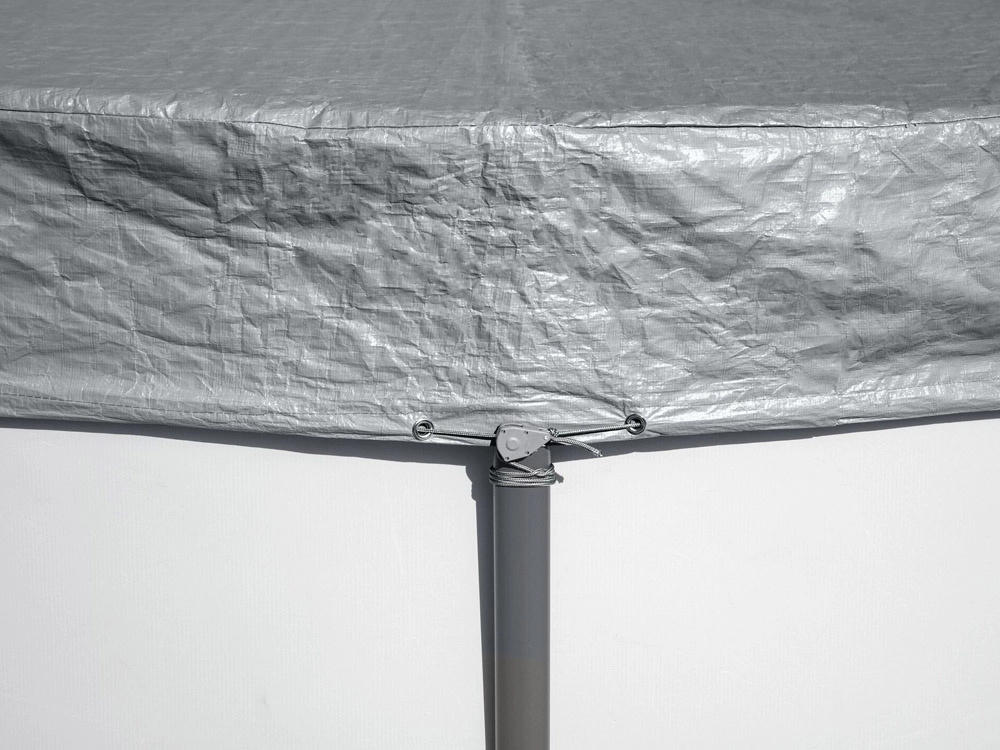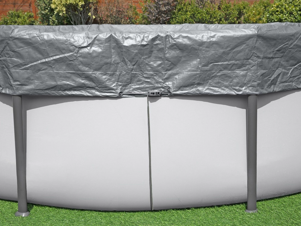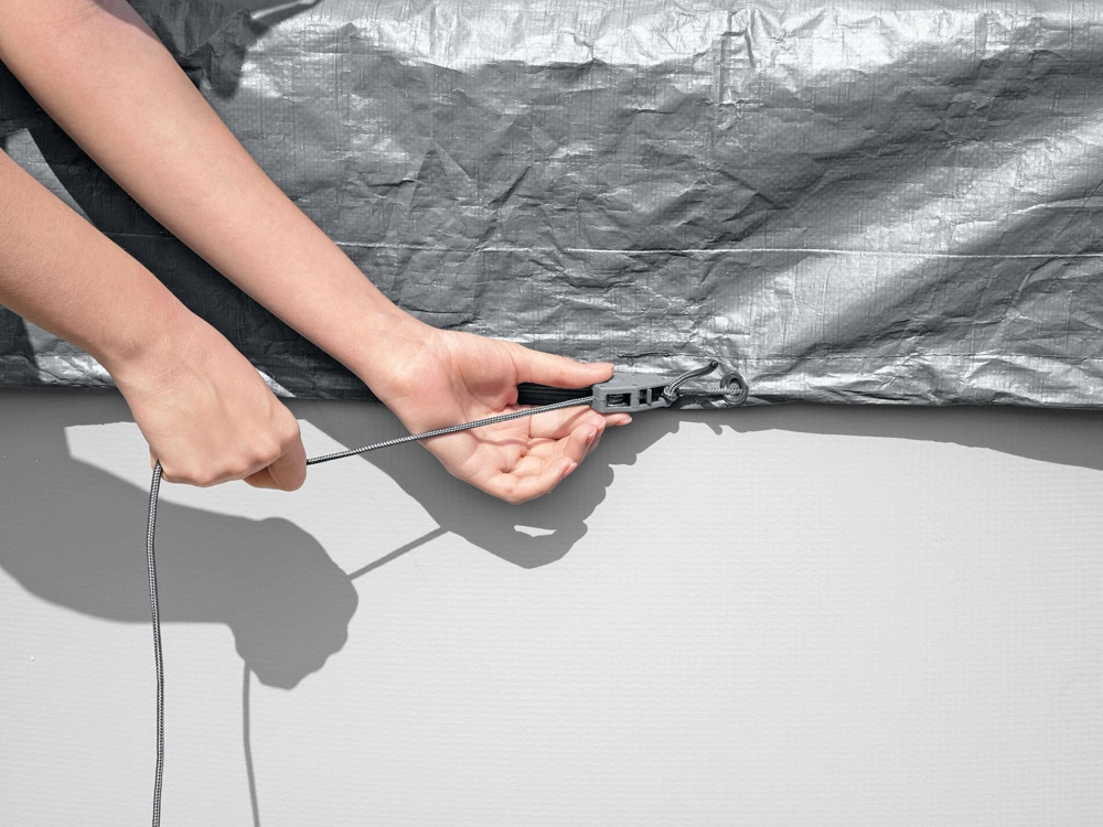 Il meccanismo di serraggio e il cordino mantengono la copertura saldamente in posizione e migliorano l’aderenza lungo tutto il perimetro della piscina.