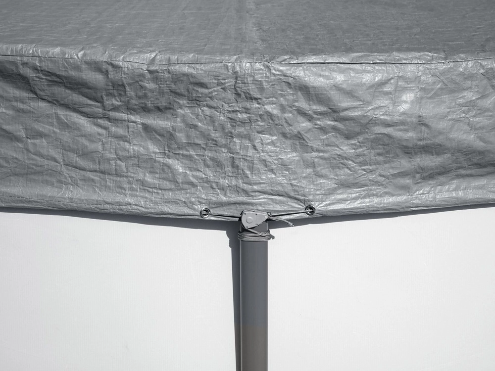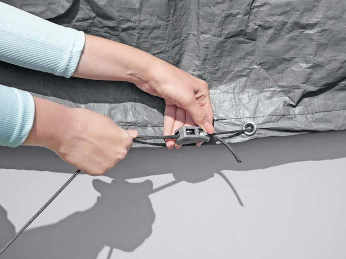 Il cordino perimetrale con fermacorda stringe saldamente il telo lungo il bordo della piscina, così da resistere anche a raffiche di vento più forti.