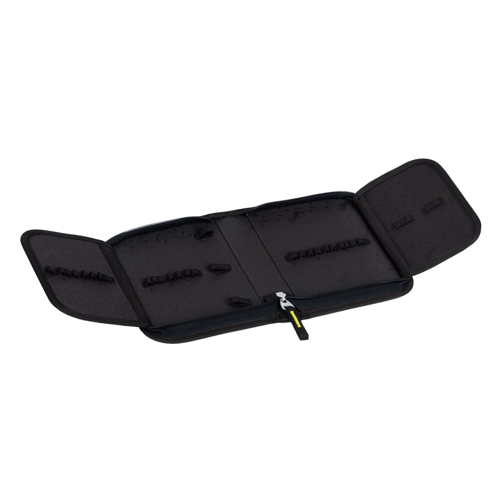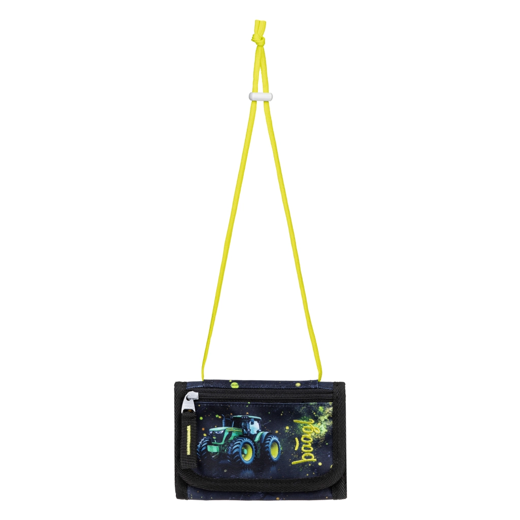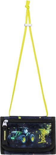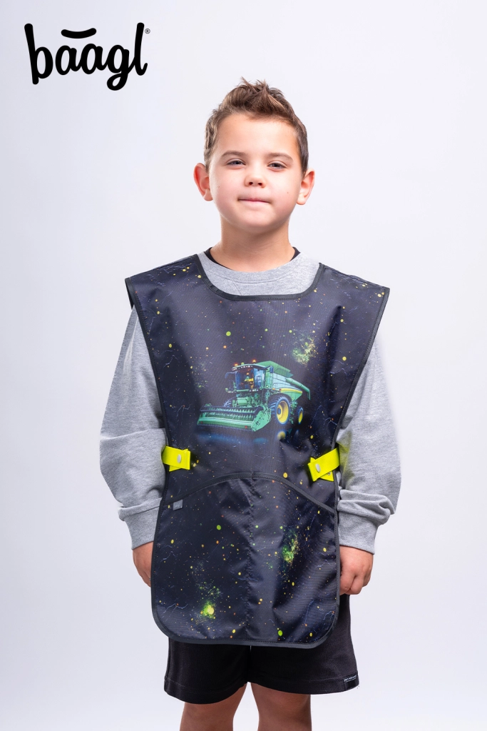 Il set comprende un classico astuccio a un solo scomparto con due alette (senza contenuto) con cerniera YKK, una pratica sacca con tasca con zip e cordini robusti, un grembiule protettivo per attività artistiche e un portafoglio compatto da collo. Tutto coordinato nel motivo “trattore” con accenti neon per la massima gioia di ogni giornata scolastica.