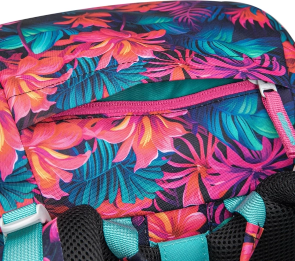 La chiusura magnetica del coperchio, intuitiva, permette un’apertura e chiusura rapida e sicura anche ai più piccoli. All’interno trovi lo scomparto principale con un organizer ben strutturato e leggere cartelle in plastica che proteggono i quaderni. La tasca termica frontale mantiene la merenda fresca più a lungo e impedisce il trasferimento degli odori alle altre parti dello zaino. Non mancano i dettagli riflettenti ben visibili e il materiale riciclato idrorepellente con certificazione GRS.