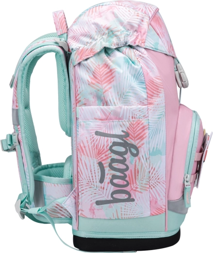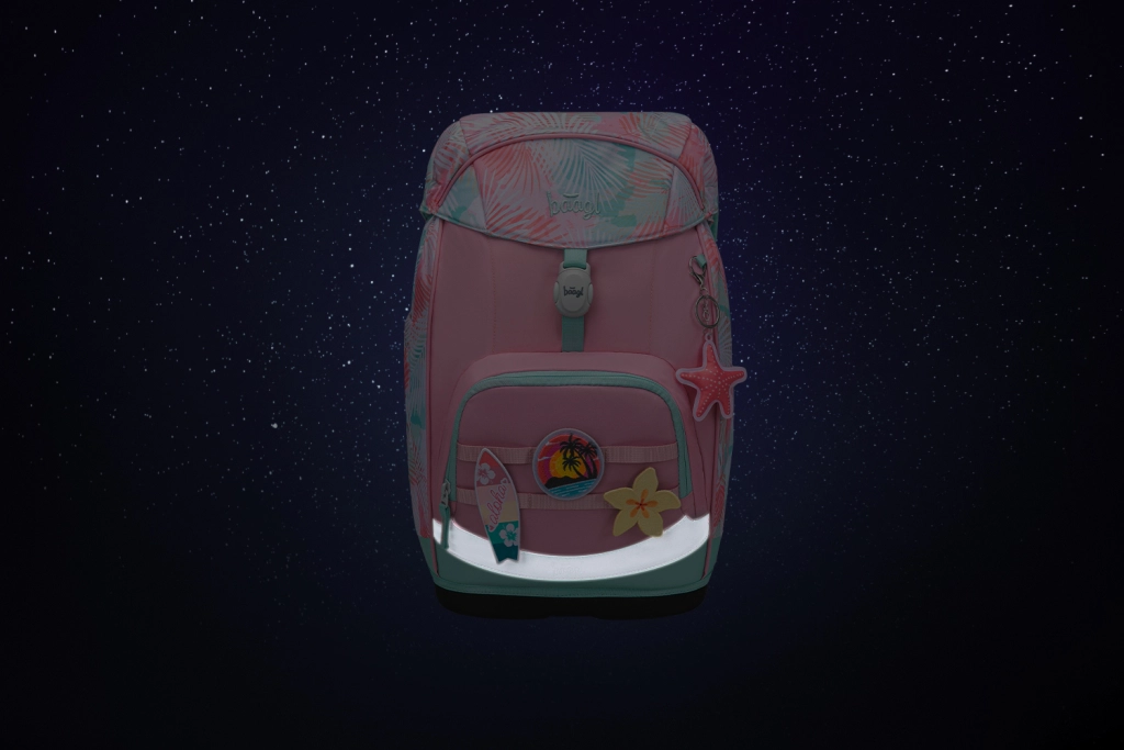 L’organizzazione intelligente include il vano principale con organizer, cartelle rigide protettive per quaderni, patta pratica con tasca con zip e tasca termica frontale per la merenda. Il look moderno è arricchito da badge intercambiabili (Baaglies) ed evidenti elementi riflettenti. L’astuccio a un piano con cerniera YKK può essere completamente aperto, dispone di una taschina per piccoli oggetti, finestrella per l’orario e elastici robusti anche per pastelli triangolari (fornito senza contenuto). La sacca con chiusura a coulisse è ideale per scarpe da ginnastica o educazione fisica, il grembiule protegge durante le attività artistiche e il portafoglio mantiene la paghetta al sicuro.