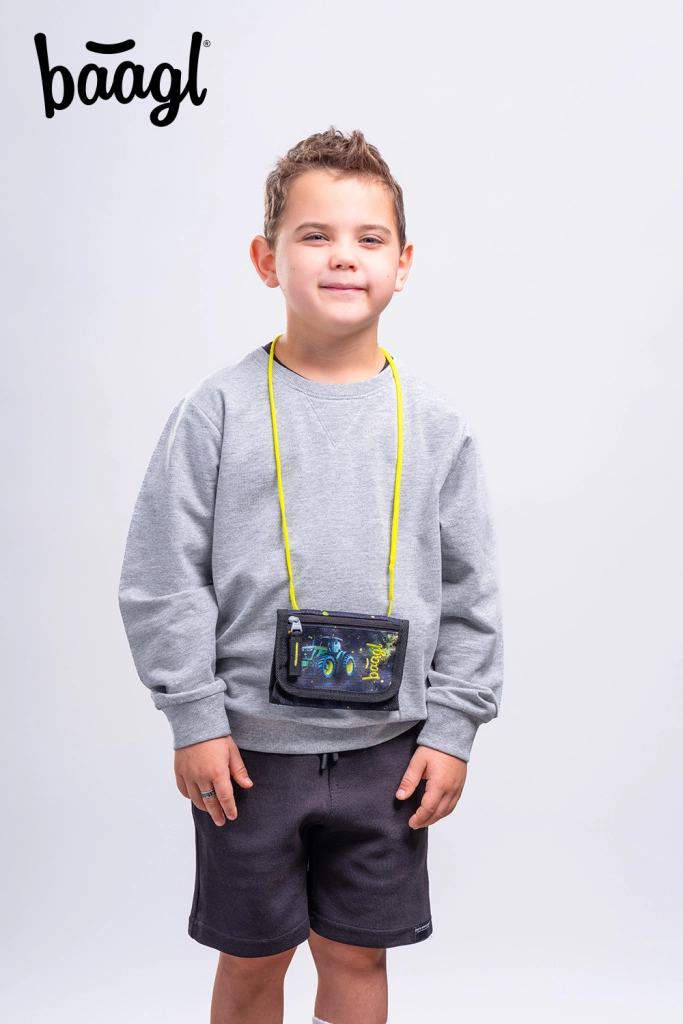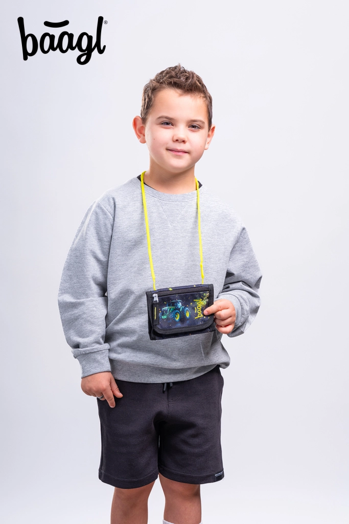 Pratico portafoglio da collo per bambini con motivo Trattore del marchio BAAGL per portare in sicurezza i piccoli oggetti. Offre abbastanza spazio per monete, badge per il pranzo o chiavi, ha un cordino regolabile con chiusura di sicurezza, chiusura a velcro ed è realizzato in materiale riciclato resistente con certificazione GRS.