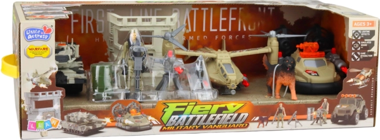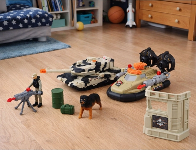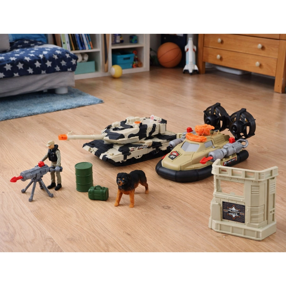 Un set militare completo per bambini che include un carro armato con effetti luminosi e sonori, un elicottero con lanciarazzi, un hovercraft, minifigure di soldati, un cane e una base militare. Grazie alla torretta girevole del carro, alle parti mobili e ai numerosi accessori, i bambini possono creare missioni, pattugliamenti e battaglie, stimolando fantasia e gioco creativo.