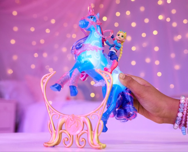 Il set ispirato all’amata serie Unicorn Academy offre ai bambini la possibilità di rivivere le scene di allenamento e creare nuove storie magiche. L’unicorno River, in plastica traslucida, si illumina in splendide tonalità di blu e, grazie all’attivazione tramite pulsante sul collare o al passaggio sopra l’ostacolo, dona al gioco un’atmosfera unica.