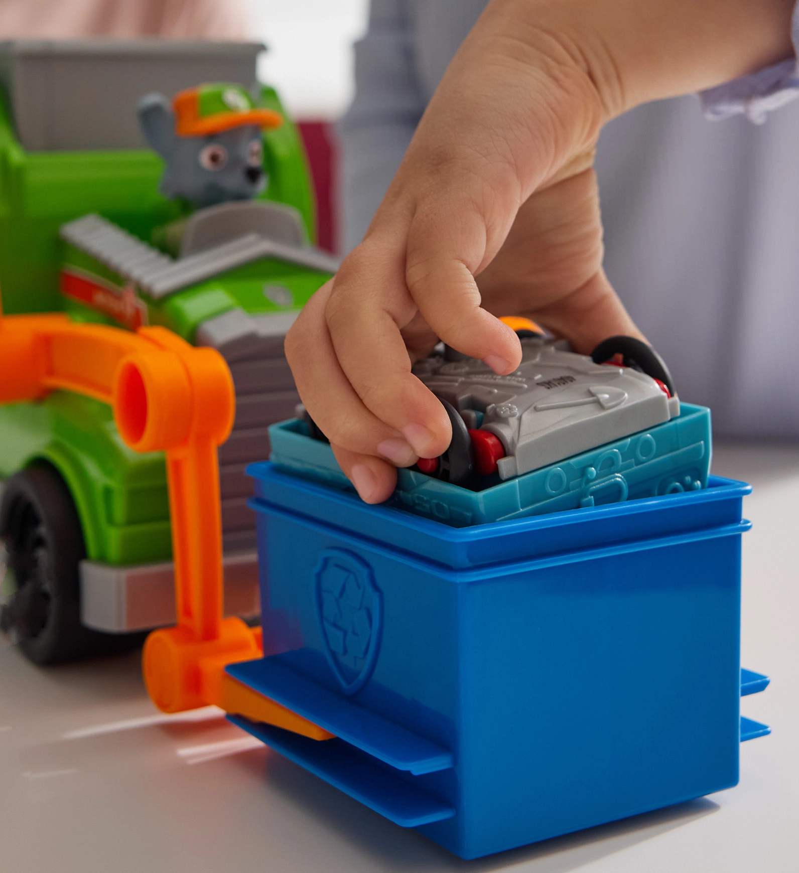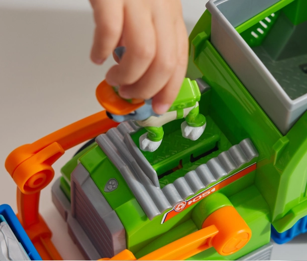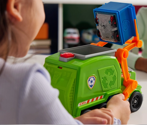 Il popolare eroe Rocky è pronto a insegnare ai bambini il riciclo e a trasformare in modo intelligente i rifiuti in oggetti utili. Il camion del riciclo Crush ’N’ Roll offre elementi realistici – bidone dei rifiuti, carrello di movimentazione e leva che avvia la frantumazione e la trasformazione del veicolo accartocciato in un mini veicolo. I bambini possono far sedere Rocky in cabina e intraprendere nuove missioni come nella serie PAW PATROL.