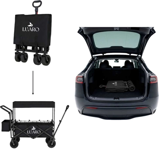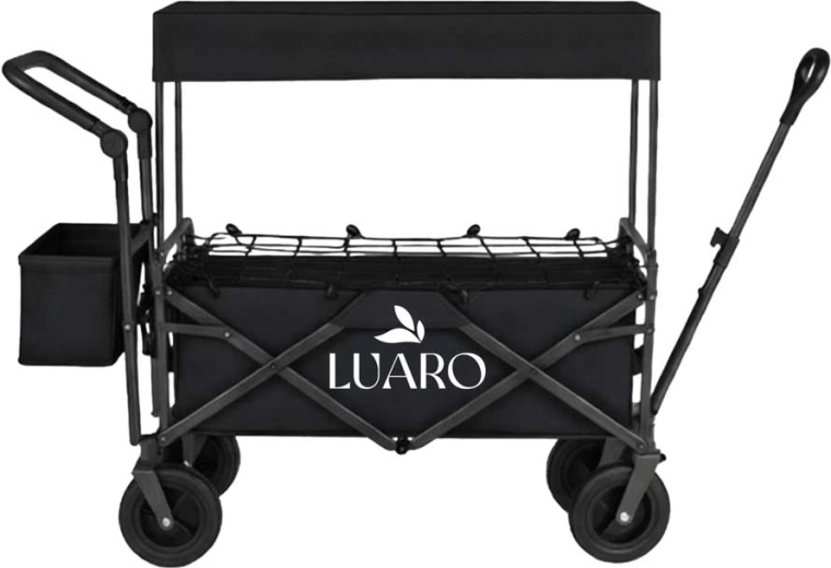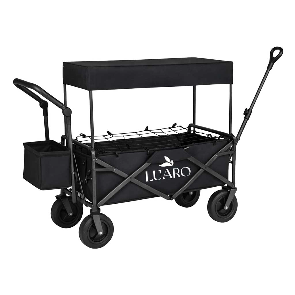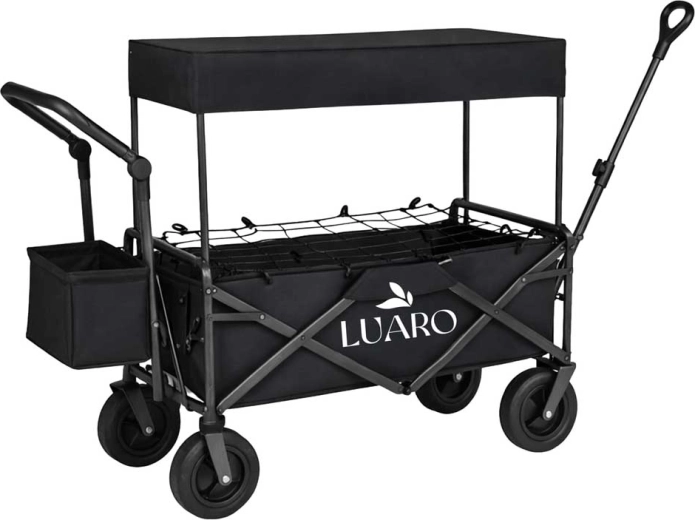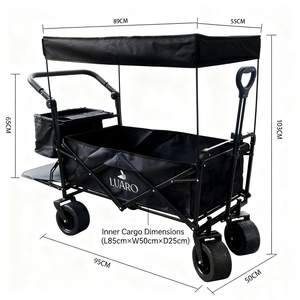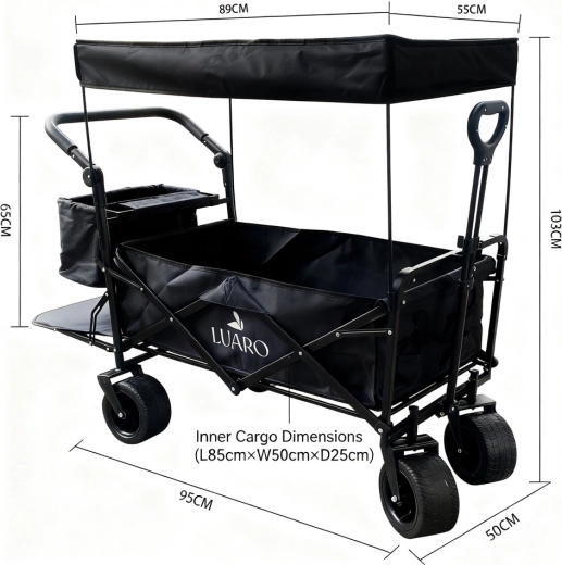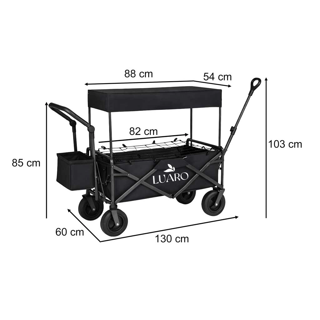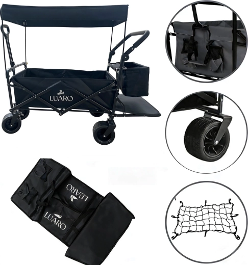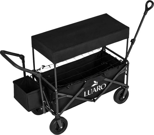 Il pratico carrello pieghevole LUARO con tettoia è ideale per spiaggia, campeggio e giardino. Offre grande capacità, robusta struttura in acciaio, ampie ruote fuoristrada e maneggevolezza confortevole grazie alla maniglia telescopica per il traino e alla maniglia posteriore per la spinta. Inclusi tettuccio protettivo rimovibile, rete di fissaggio del carico e borsa laterale aggiuntiva per una migliore organizzazione.