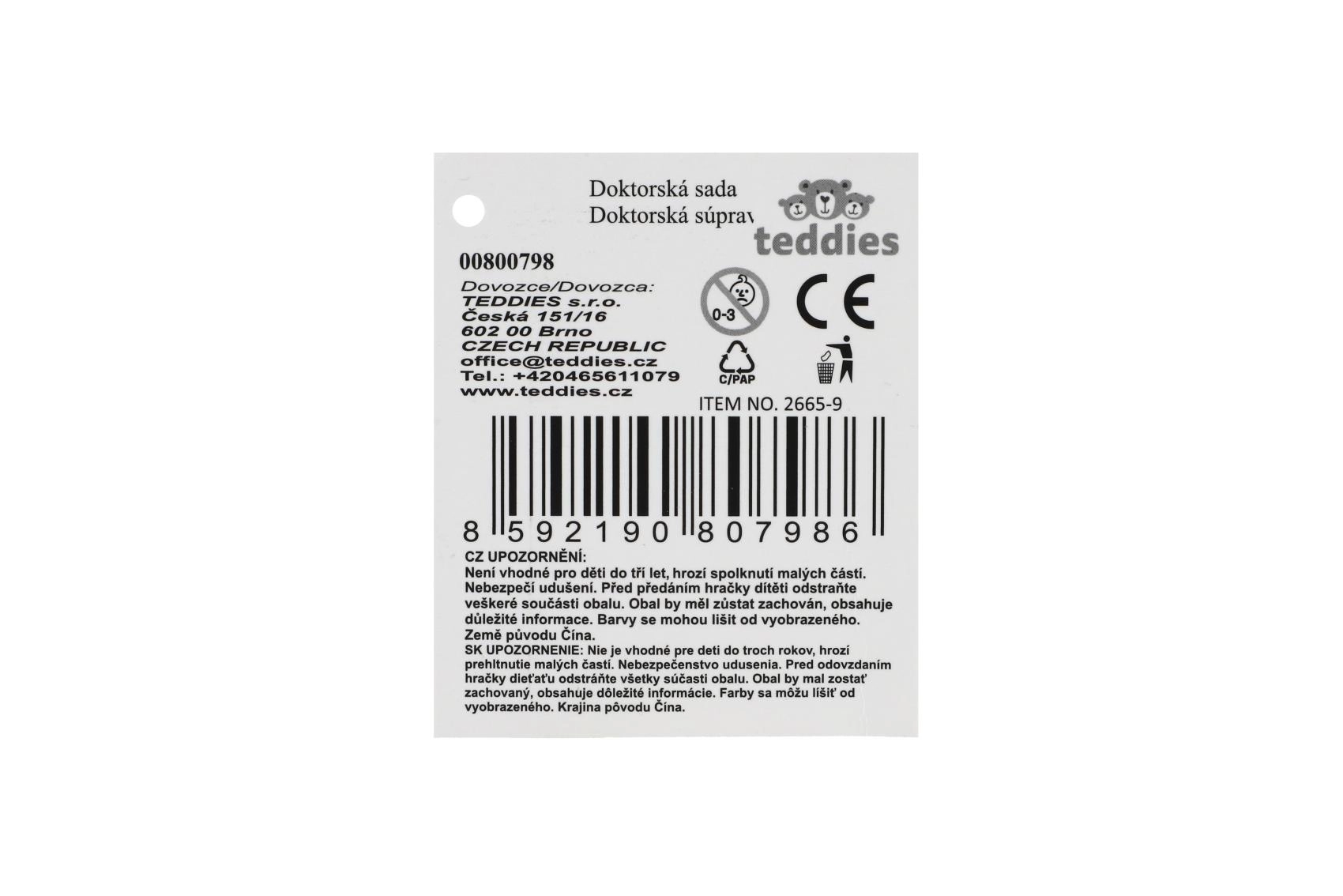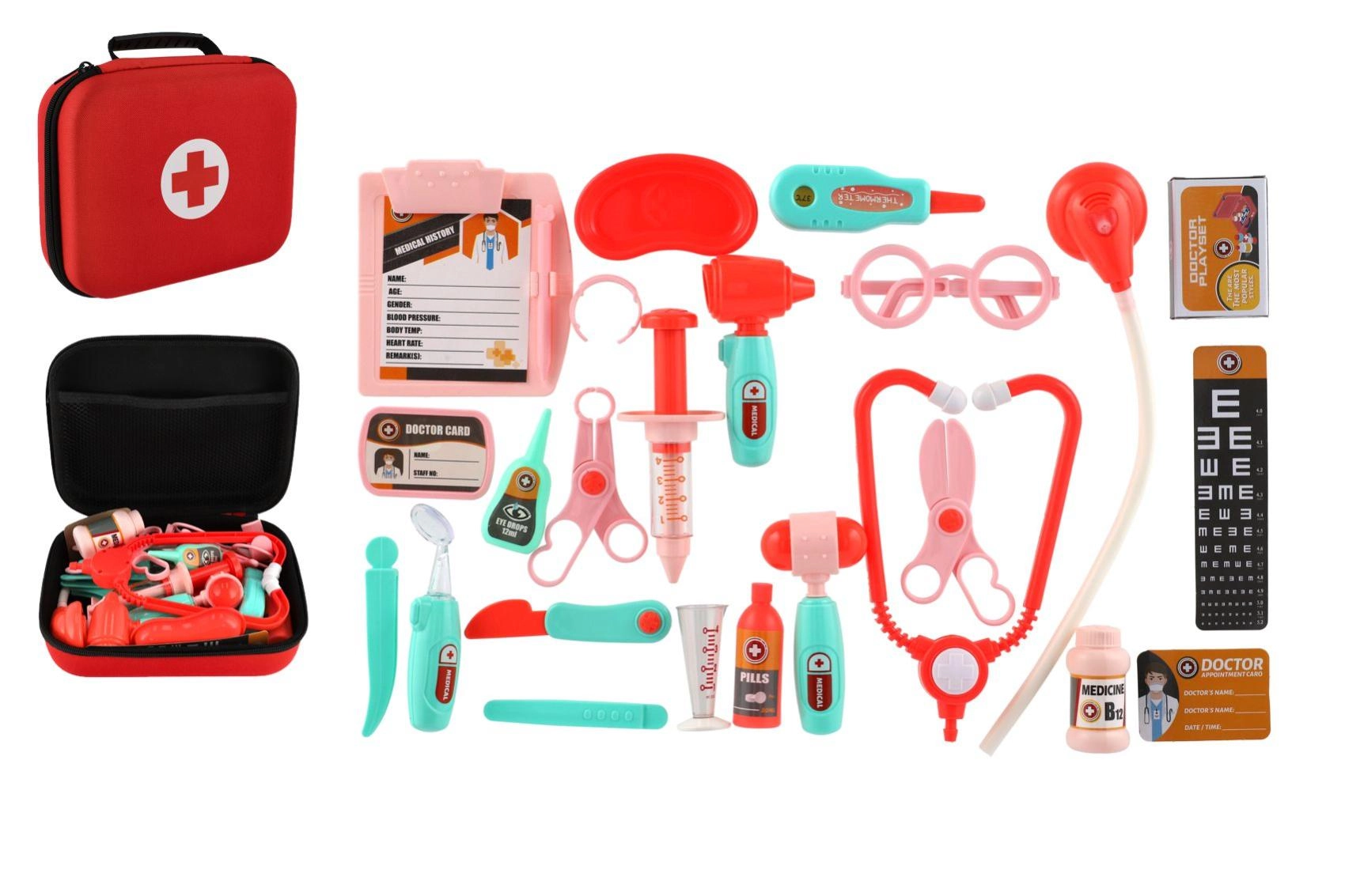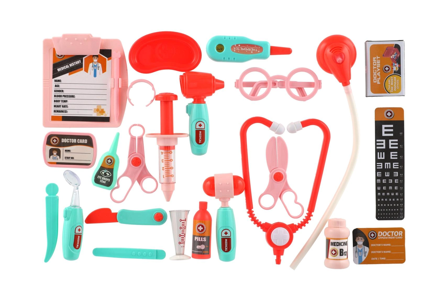 - Stetoscopio, siringa, otoscopio, termometro, forbici, martelletto, occhiali, pinzetta, boccette per “medicine”, cartoncini e altri accessori