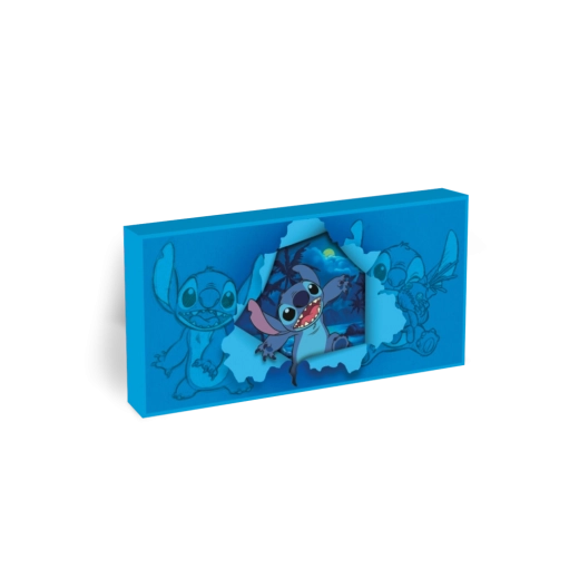 L’originale quadro luminoso Lilo & Stitch trasforma ogni stanza in un luogo magico. La delicata retroilluminazione blu mette in risalto i dettagli, crea un’atmosfera incantata e farà felici fan piccoli e grandi. Grazie all’alimentazione con 2× batterie AA lo posizioni facilmente ovunque, senza cavi né prese.