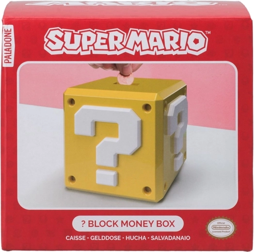 Elegante salvadanaio ispirato alla serie di videogiochi Super Mario a forma dell’iconico Blocco Interrogativo. Plastica resistente, pratica fessura per le monete in alto e sportellino inferiore per un facile prelievo dei risparmi. Ideale come decorazione, regalo per fan e per il risparmio di tutti i giorni.