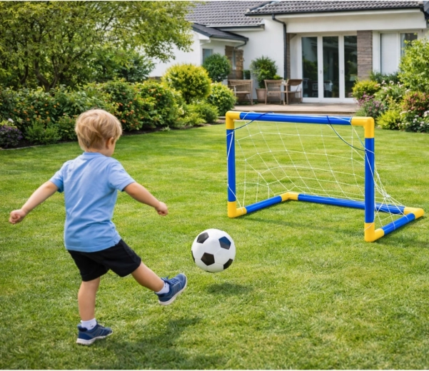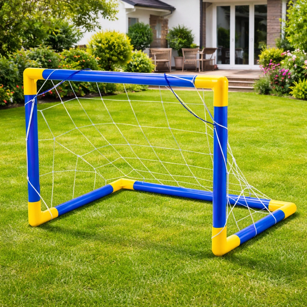 Porta da calcio leggera e stabile per bambini con accessori completi – pallone, pompetta e rete – per allenarsi divertendosi a casa e all’aperto. Montaggio facile, tubi in plastica resistenti e dimensioni compatte che favoriscono movimento, coordinazione e precisione di tiro.