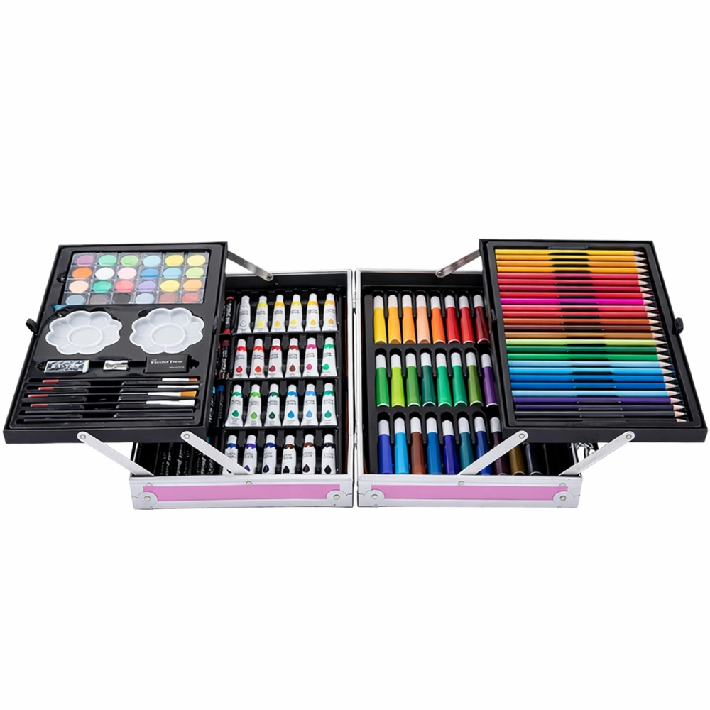 Il set include una ricca gamma di matite colorate, pennarelli, pastelli, acquerelli, pennelli e altri accessori, tutti perfettamente organizzati nei pratici scomparti a livelli della valigetta.