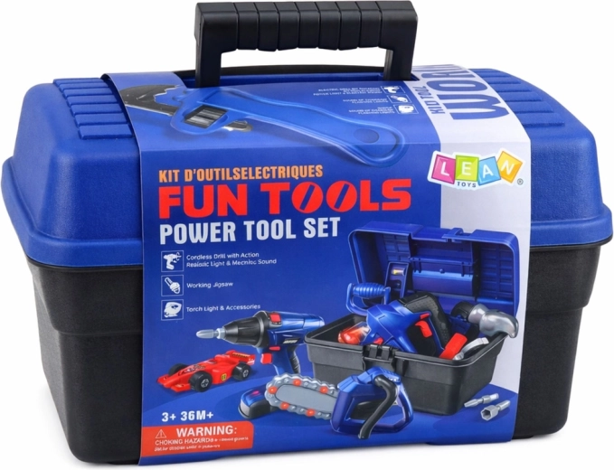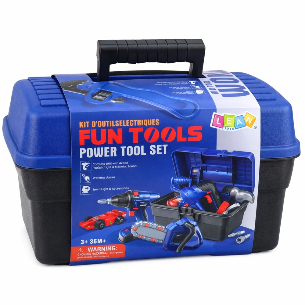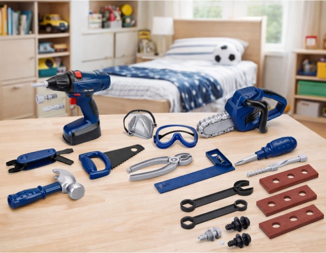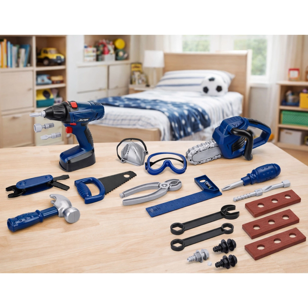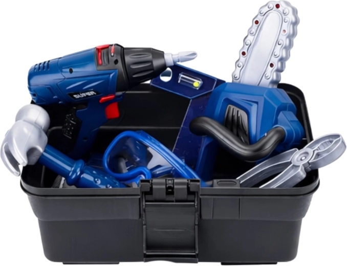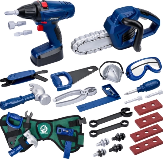 Pratico set di attrezzi per bambini in una valigetta portatile con fino a 30 pezzi per un gioco da piccoli riparatori realistico. Include un avvitatore a batteria, martello, sega, chiavi, cacciavite, pinze, elementi di montaggio e occhiali e maschera protettivi. La plastica leggera e resistente garantisce un utilizzo sicuro e confortevole, mentre la valigetta con manico facilita l'organizzazione e il trasporto.