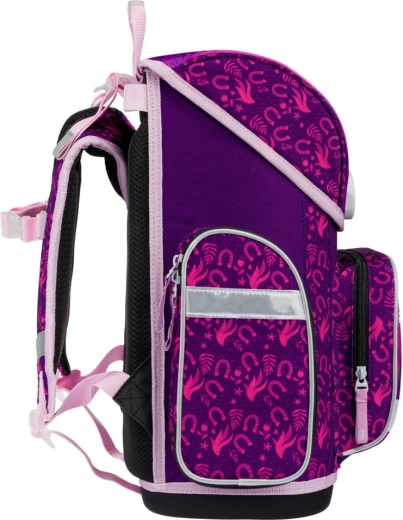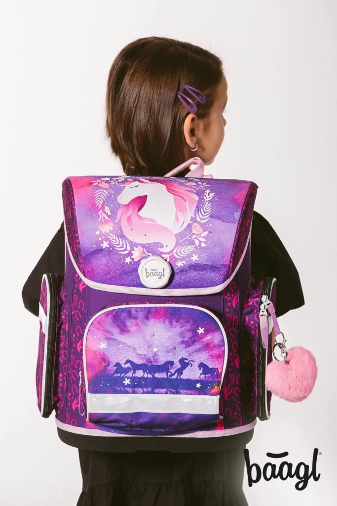 Il set scolastico BAAGL Ergo Cavallo è stato progettato per bambini dalla 1ª classe della scuola primaria. La cartella ergonomica con sistema scorrevole ERGO ADJUSTABLE SYSTEM cresce con il bambino e, grazie allo schienale imbottito, alle bretelle, alla cinghia pettorale e a quelle laterali regolabili, garantisce un trasporto comodo e salutare. La struttura stabile con fondo rigido, il materiale idrorepellente e i numerosi elementi riflettenti proteggono sia il contenuto che il vostro bambino durante gli spostamenti.