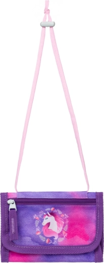 Sacca per le scarpe con chiusura a coulisse, astuccio a due alette, grembiule lavabile e portafoglio da collo con sicura – tutto in un design coordinato con motivo cavallo.