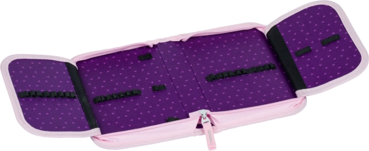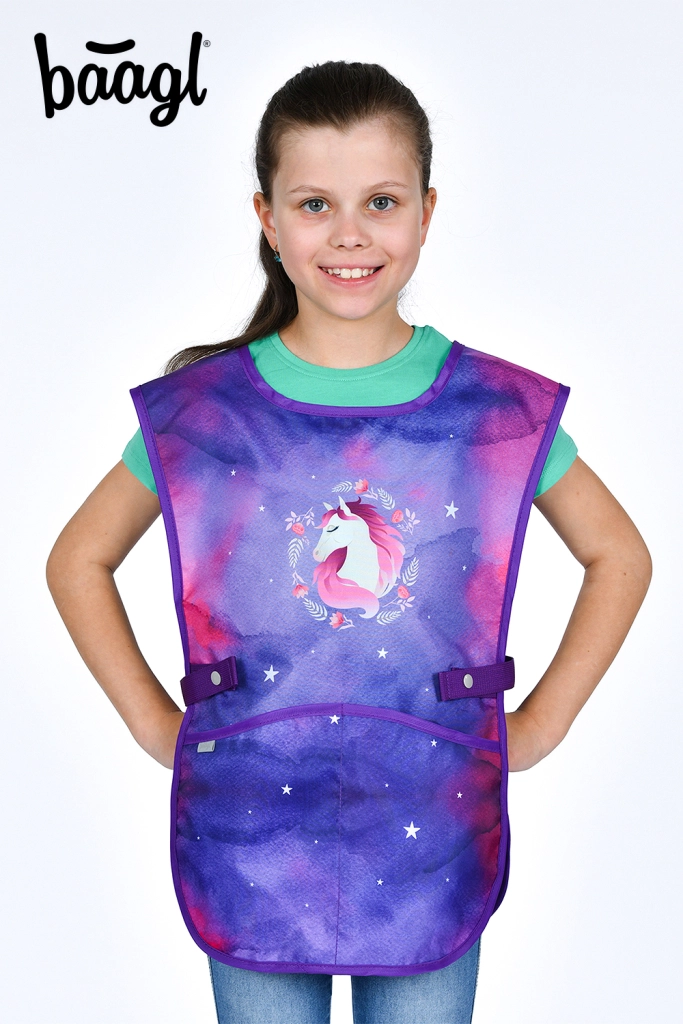 La dotazione pratica include una tasca frontale isolata, due tasche laterali per la bottiglia, un organizer interno e una tasca trasparente con l’orario. Il resto del set comprende una sacca per le scarpe con chiusura a coulisse, un astuccio classico a due alette, un grembiule artistico lavabile con due tasche e un portafoglio da collo con sicura di sicurezza e taschina separata per le monete.