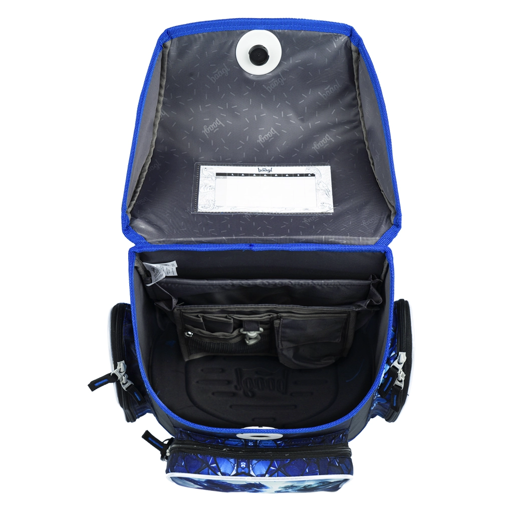 L’organizzazione interna pratica con organizer, tasca trasparente per l’orario, tasca frontale isolata e due tasche laterali mantiene tutto in ordine. Il set è completato da un astuccio a un solo scomparto (senza contenuto) con zip YKK, una sacca resistente con coulisse da portare sulle spalle e moschettone per fissarla alla cartella, un grembiule per bambini lavabile con due tasche e un portafoglio da collo con targhetta nome e fermo di sicurezza sul laccetto.