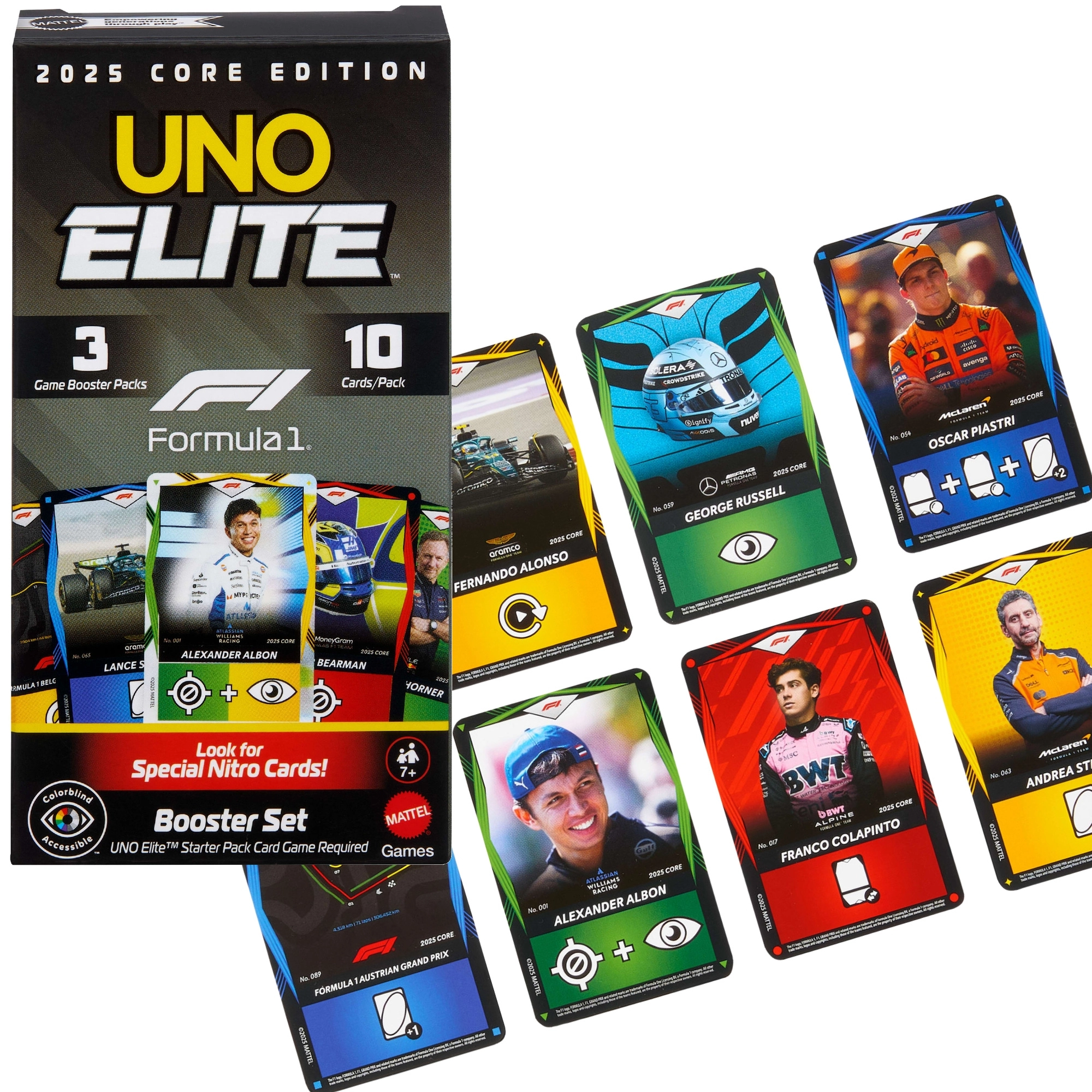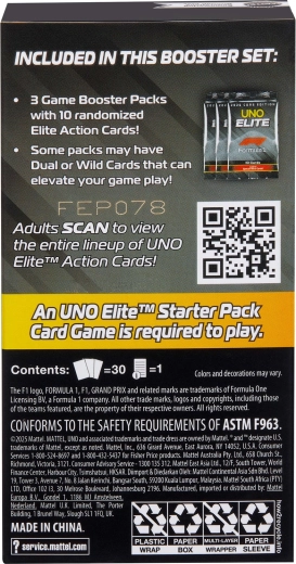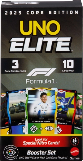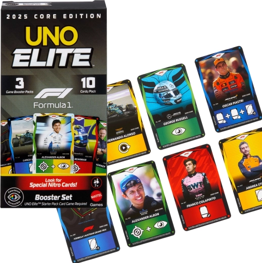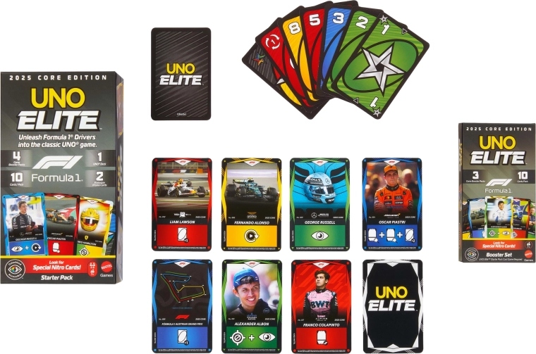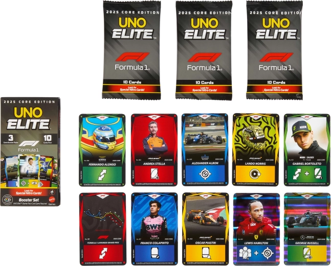 Entra nel ritmo frenetico delle gare con l’espansione UNO Elite Formula 1 2025. Ogni Booster Pack propone carte selezionate casualmente con temi di piloti F1, monoposto, caschi e circuiti. Le carte Elite speciali attivano le loro abilità quando viene giocata una carta con l’icona Elite dello stesso colore, offrendo nuove strategie e momenti avvincenti in ogni partita.